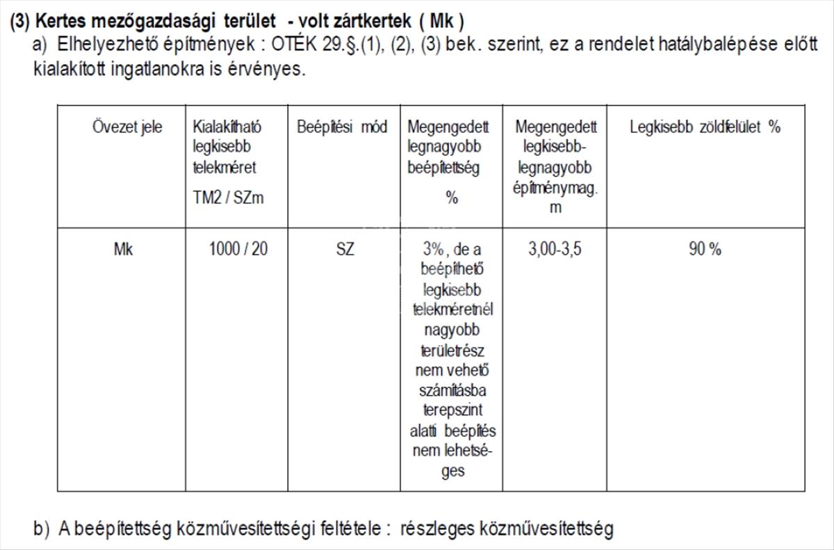 A telek Mk (kertes mezőgazdasági) építési övezetbe tartozik, ahol:
