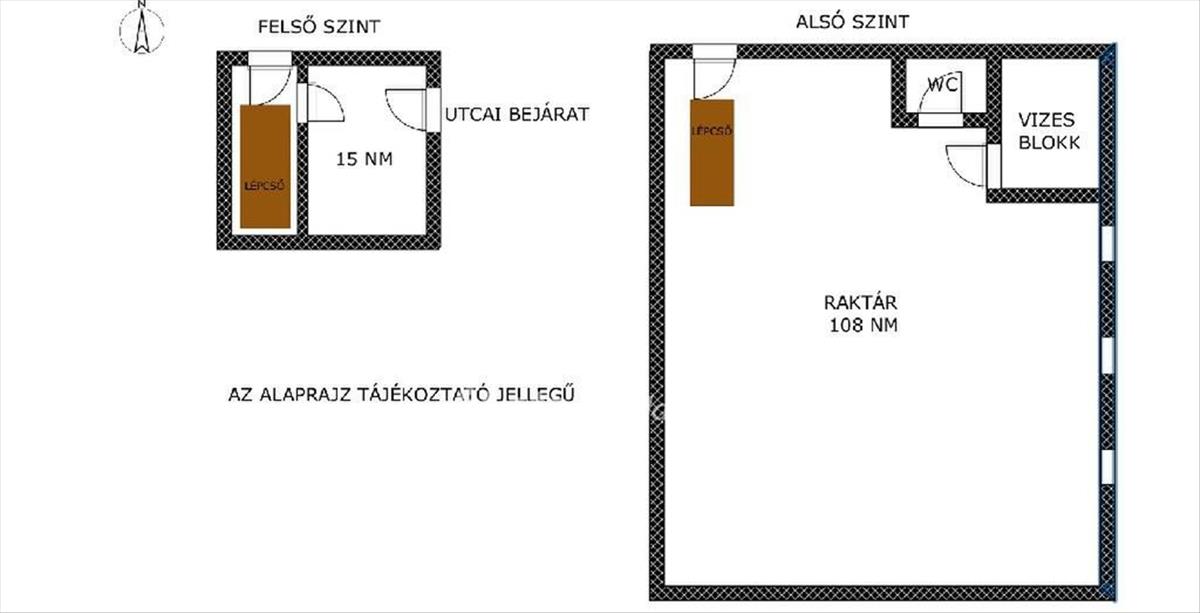 A felső - 15 nm - közvetlenül az utcáról közelíthető meg, ebből nyílik a raktár - 108 nm -, amely 14 lépcsővel lejjebb található. a közművek a gáz kivételével benn vannak.