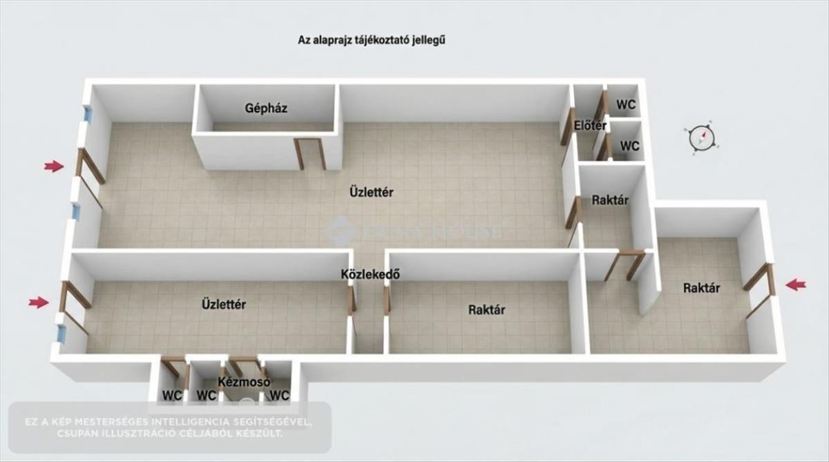 Az ingatlan nem lakóházzá minősített, kialakítása üzleti-ipari célokat szolgál.
