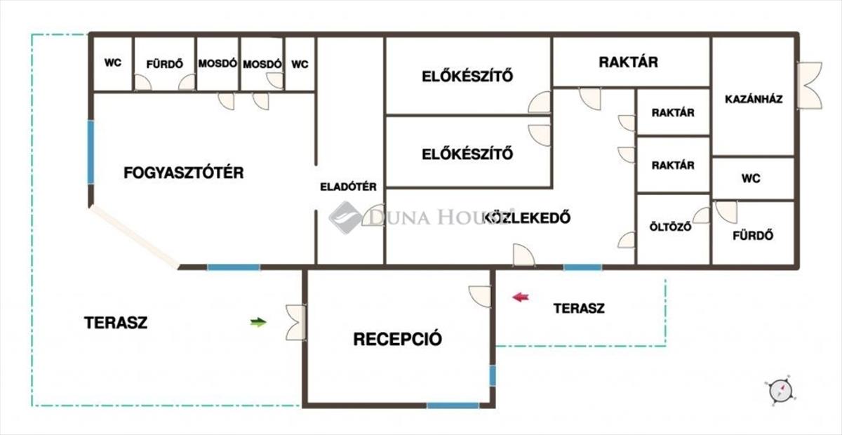 Az épület alsó szintjén recepció található, valamint korábban gyros-ként működött az ingatlan egy részében. a helyiségek elrendezése miatt továbbra is alkalmas lehet szálláshely, iroda, szolgáltató egység vagy vendéglátóhely kialakítására.