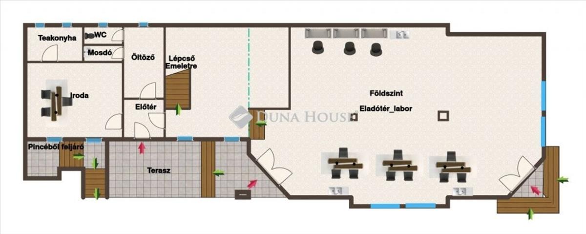 A földszintre lépve (130 m2-nél nagyobb) tágas térbe érkezünk, mely üzlethelyiség, munkaállomás, szolgáltatótér funkcióra is alkalmas. a földszinten további iroda, öltöző, vizesblokk is helyet kapott.