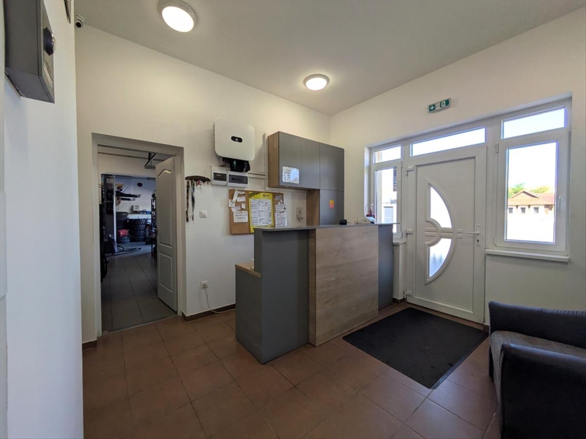 A földszinten – bruttó 200 négyzetméteren – engedéllyel rendelkező és jelenleg is működő autókozmetika, gumiszerelőműhely, ügyfélfogadó tér vizesblokkal, raktár, gépészeti helyiség, valamint dolgozói öltöző található.