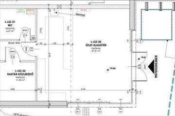 -37 m2-es eladótér kerámia járólappal, 12 m2 raktár-helyiség kerámia járólappal és egy 6 m2-es wc helyiség szintén kerámia járólappal.
