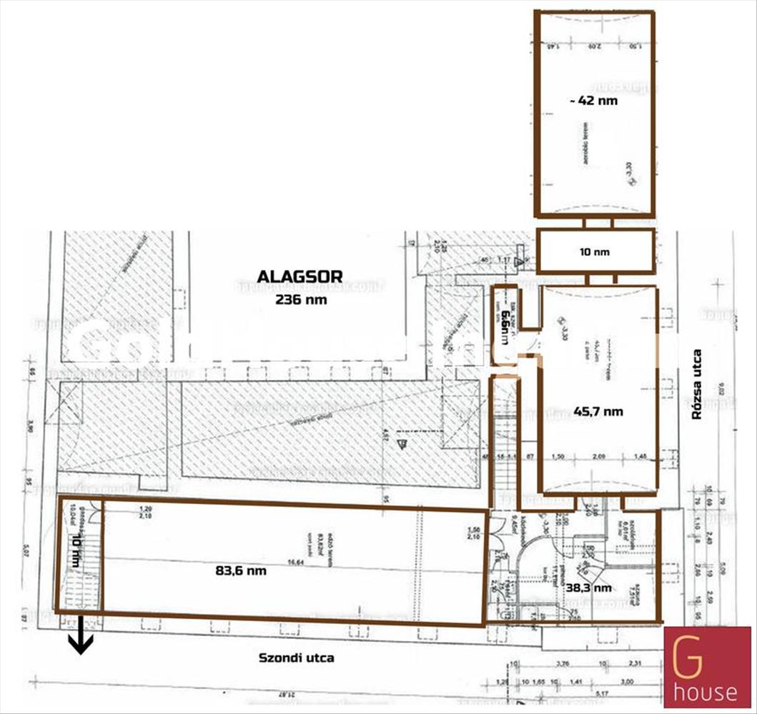 Alagsor (236 nm ): 3 nagy helyiség: 83 nm , 46 nm és 42 nm , közlekedő, szauna-tér, vizesblokk