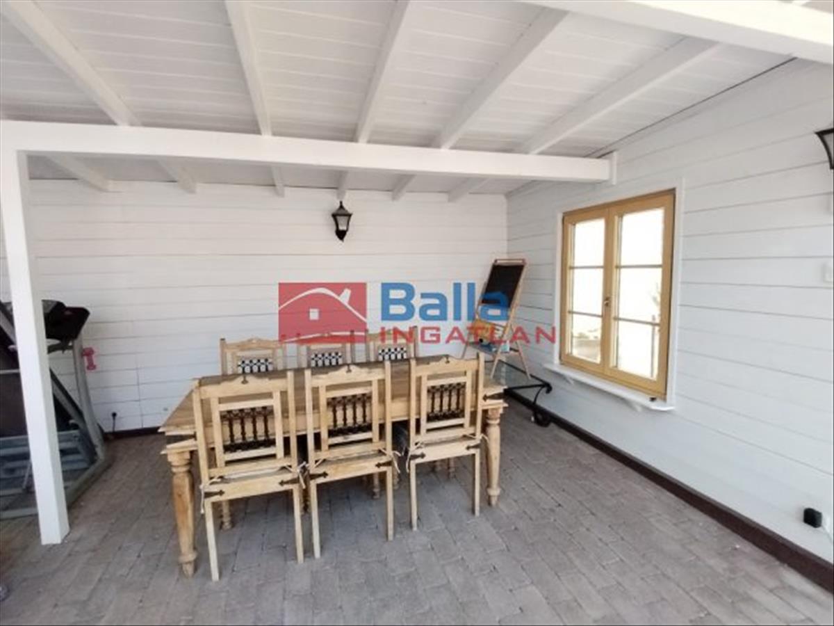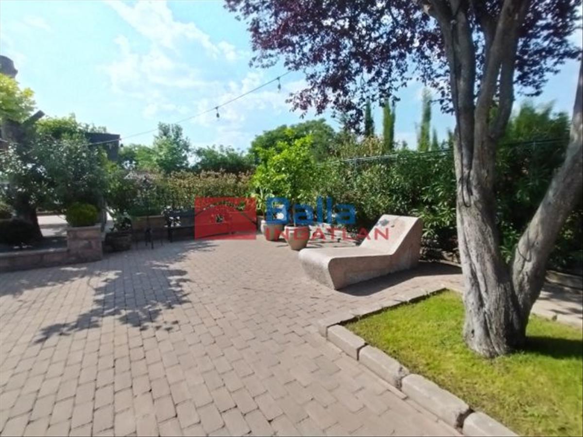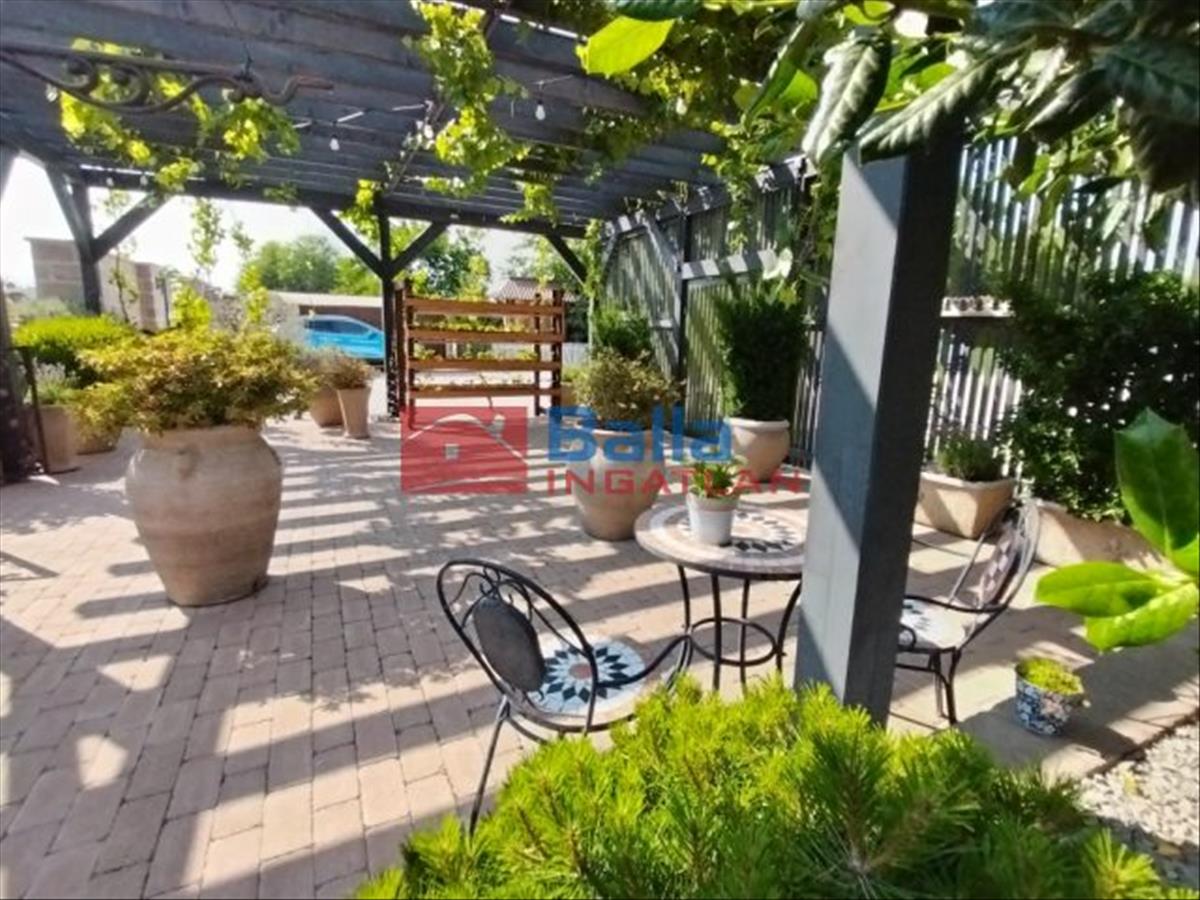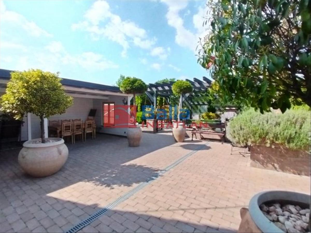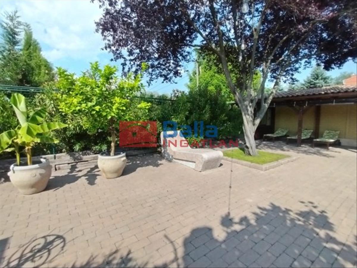 Négyállásos garázs, nagy méretű udvar, parkosított kert fűtött medencével és pihenőtérrel, valamint különálló szaunaház tíz fő számára.
