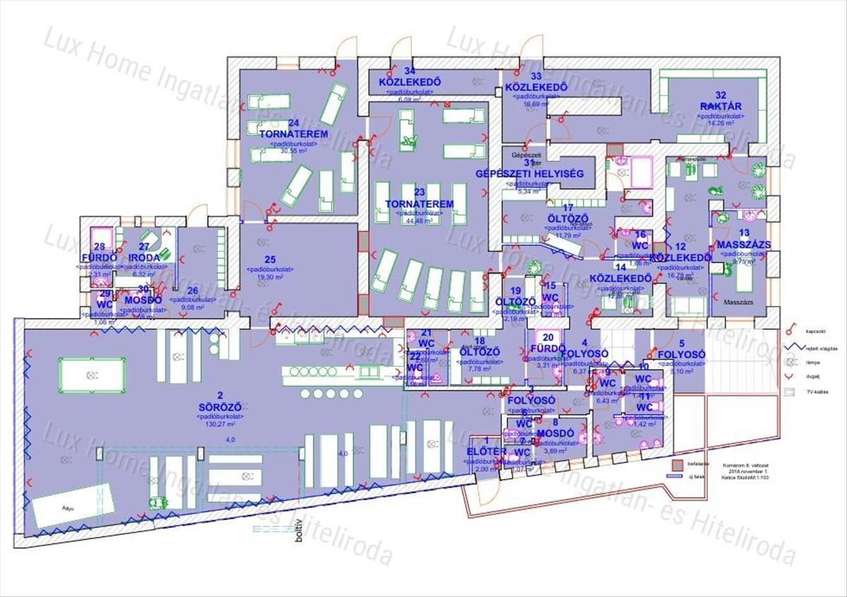 - Tornaterem, öltözők, zuhanyzók, irodák, raktár, masszázsszoba és vendégmosdók is találhatók benne.