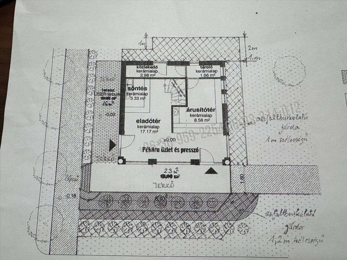 Helyiségek: eladótér, árusítótér, kiszolgálótér, 2 raktár, tetőtérben kiszolgálótér, 2 külön Wc mosdóval, tároló.