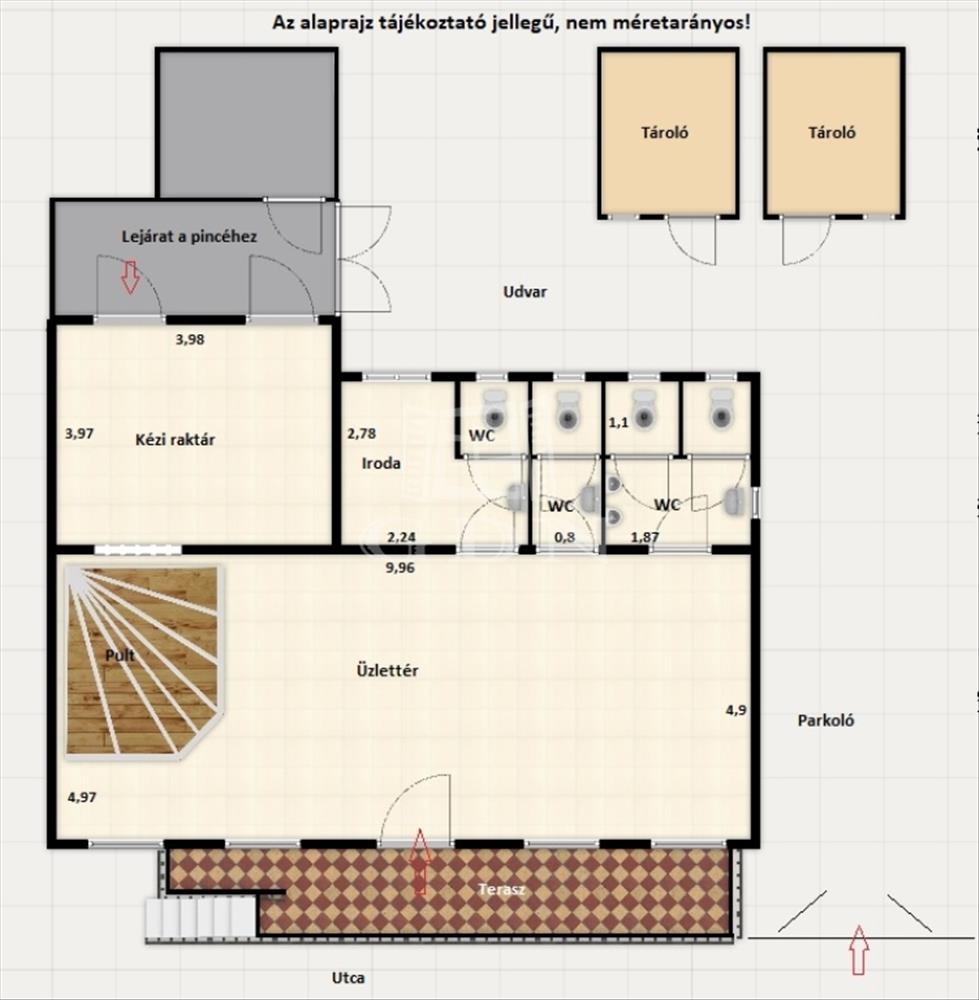 -6 m² iroda, melyben egy 0, 8 m² személyzeti wc van,