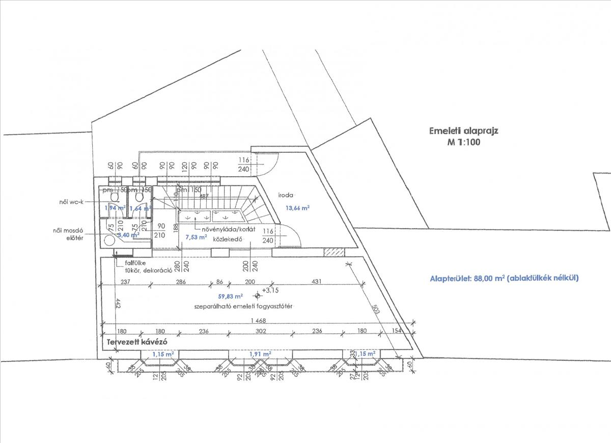 az emeleti 100 m2 leválasztható, ami lakás vagy irodák kialakítására alkalmas.