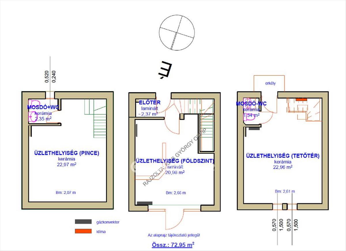 Helyiségek: földszint: üzlettér, előtér-lépcső (23, 33 m2); tetőtér: üzlettér, WC-mosdó (25, 32 m2); tetőtér: üzlettér, WC-mosdó (24, 3 m2).