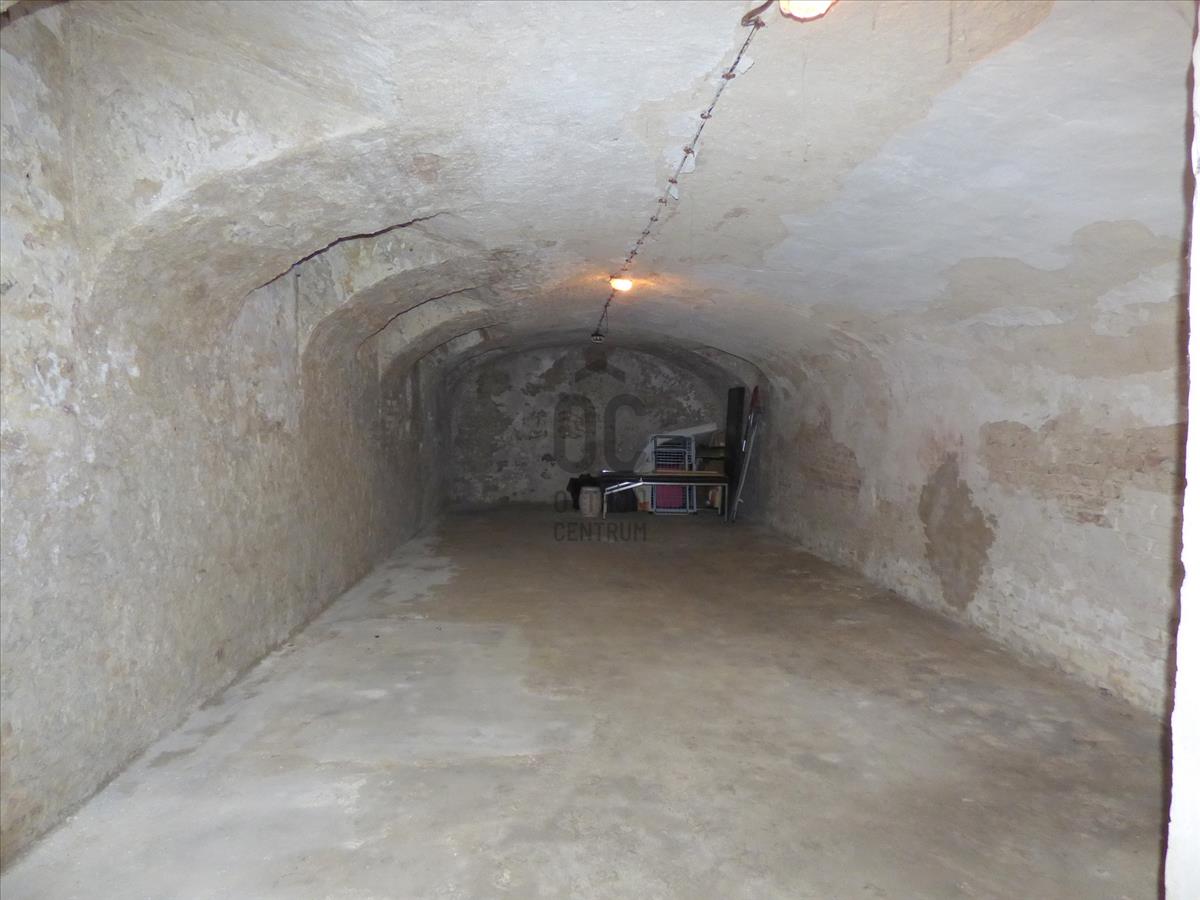 Sima beton padló, vakolt falak és vészkijárat a belső udvar felé. Világítás van lent. Belmagasság a boltozat közepén mérve 268 cm.