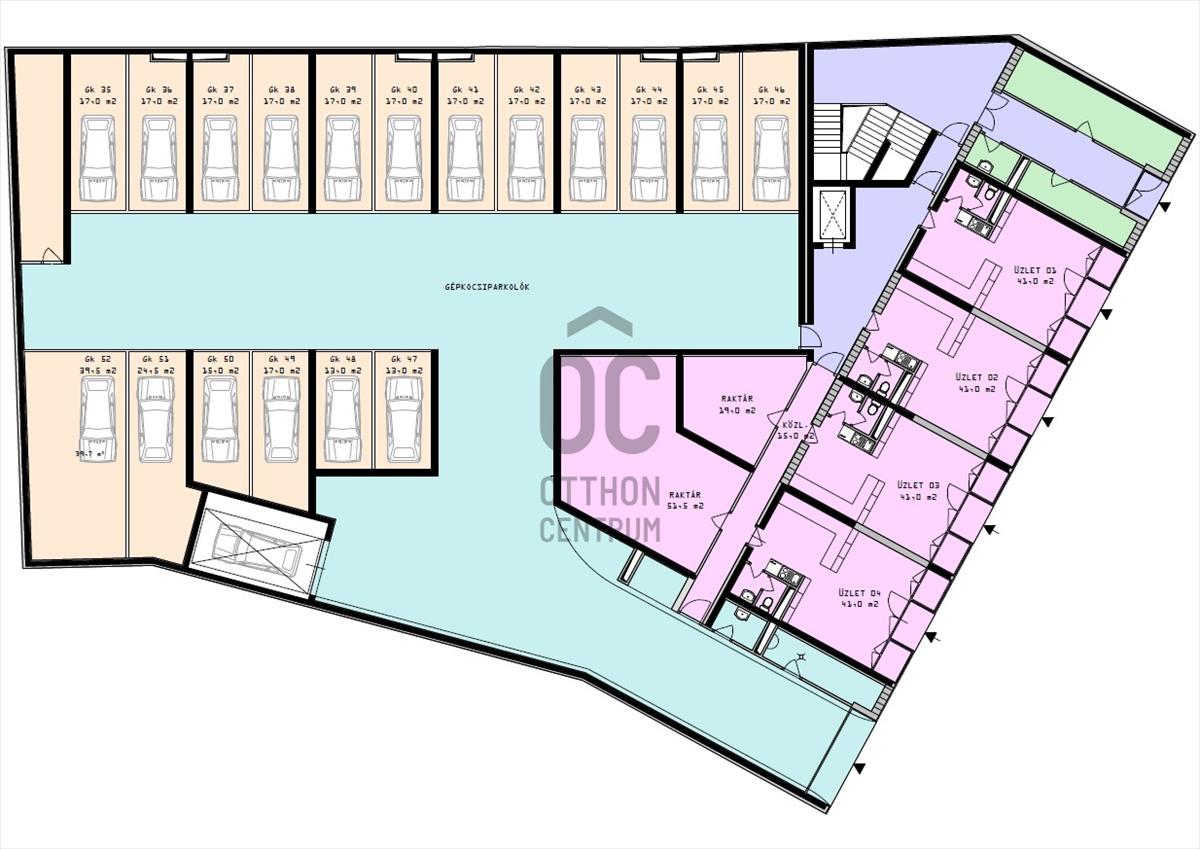* 2 db 41 m2, és egy-egy 63 m2 és 73 m2 üzlethelyiség az épület földszinti utcafrontján, utcai bejárattal és kirakattal.