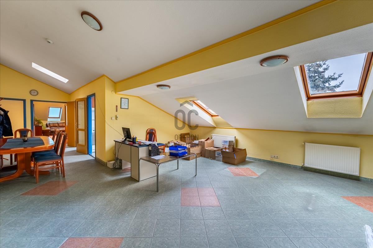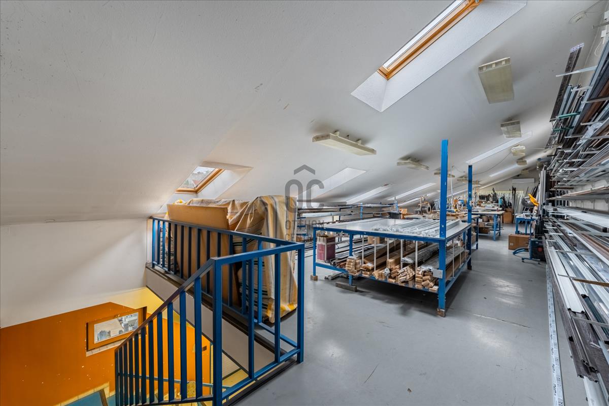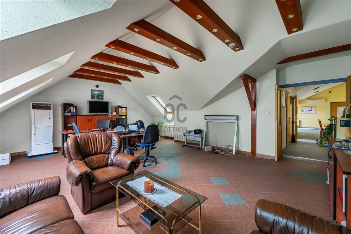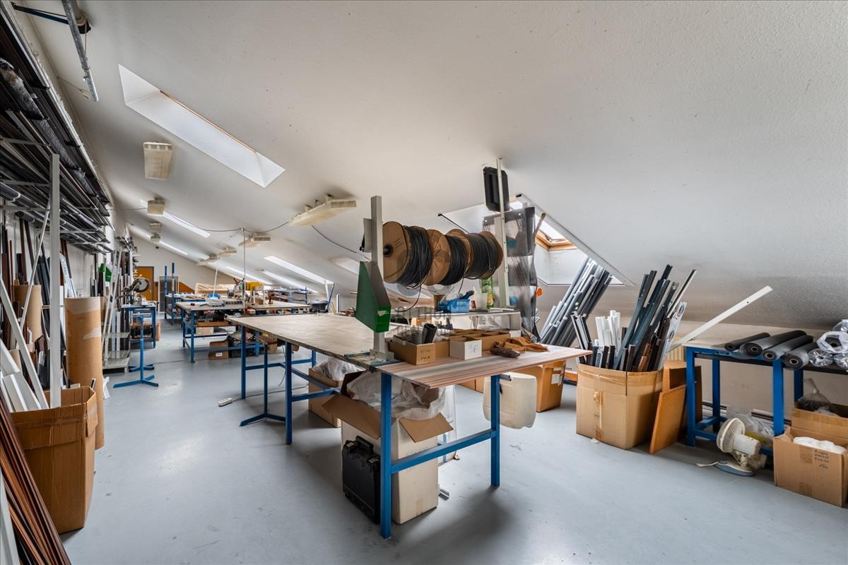A félnyeregtetős, 3, 5 m csúcsmagasságú beépített tetőtéren egy nagyobb irodai helyiség, egy fürdőszoba, egy konyha, illetve üzemi funkciókra alkalmas tér található.