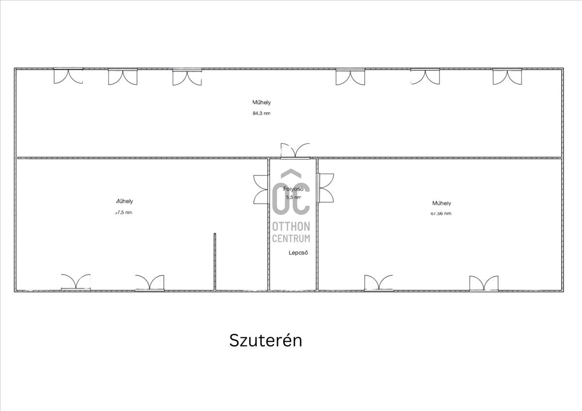 Az épület földszinti része 234 m², 10 irodával, mellékhelyiségekkel és tágas folyosóval.