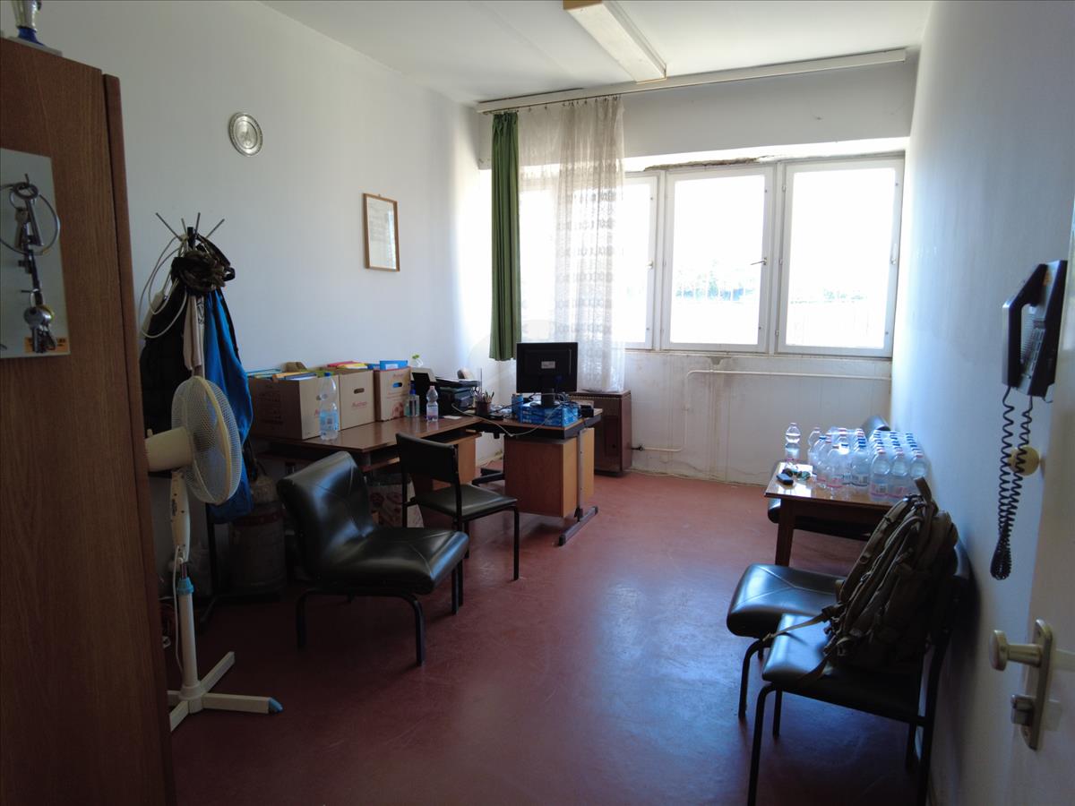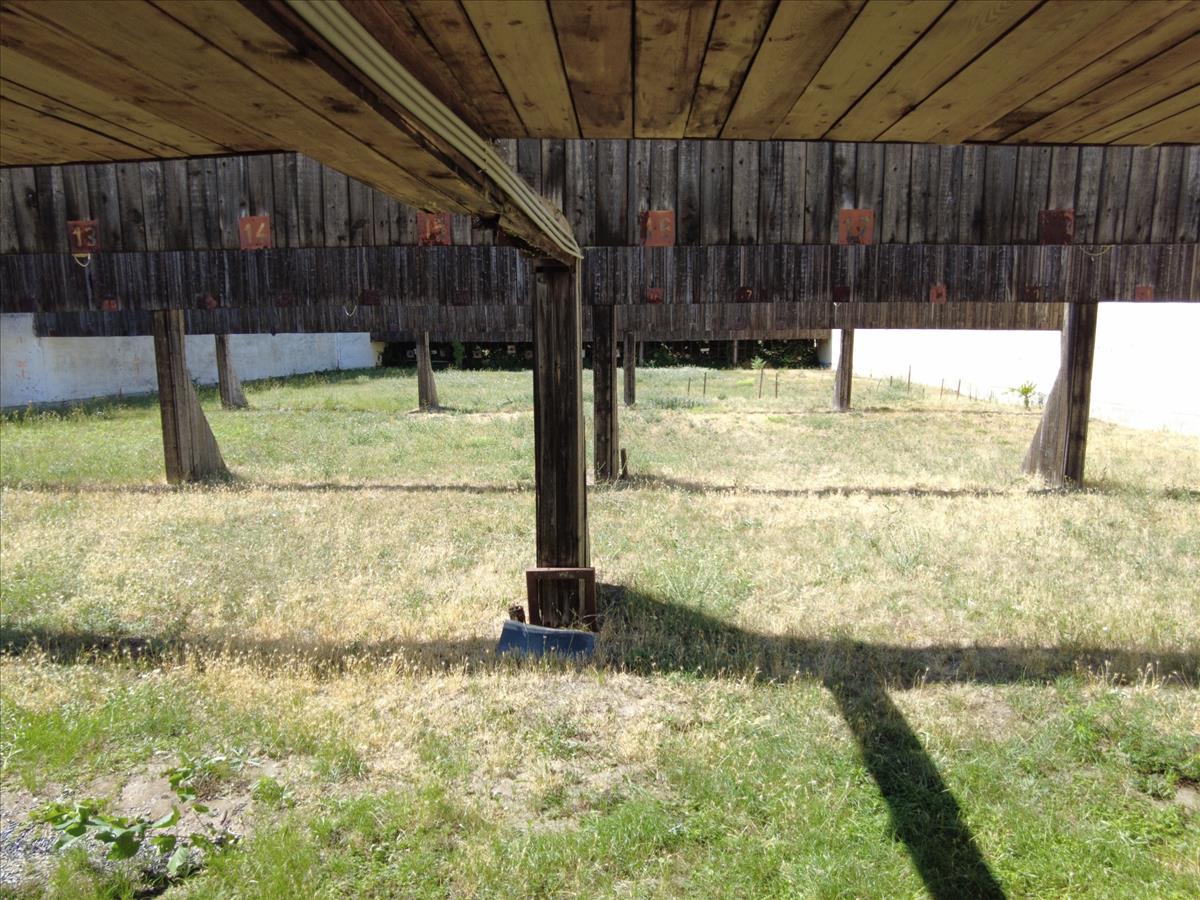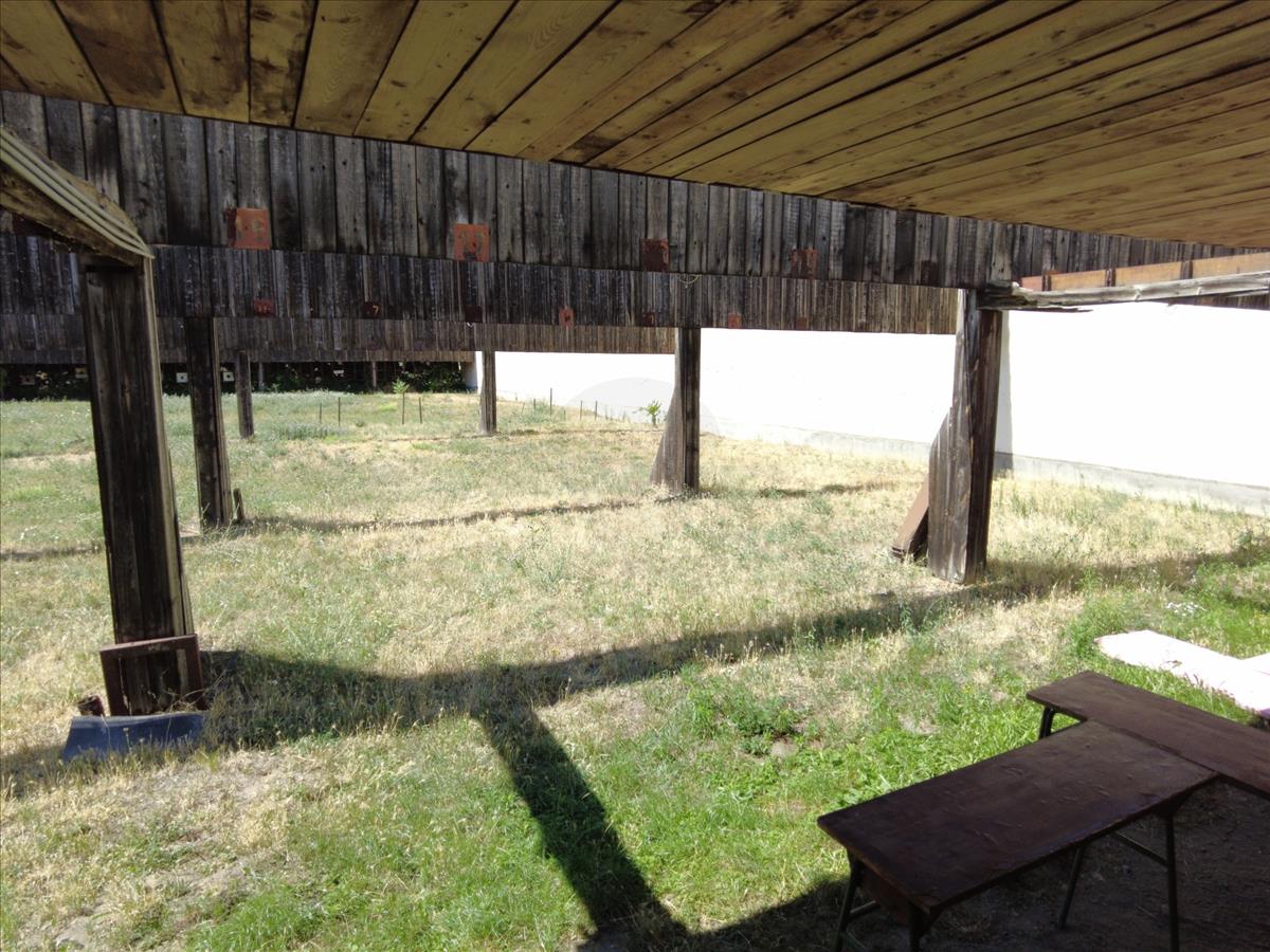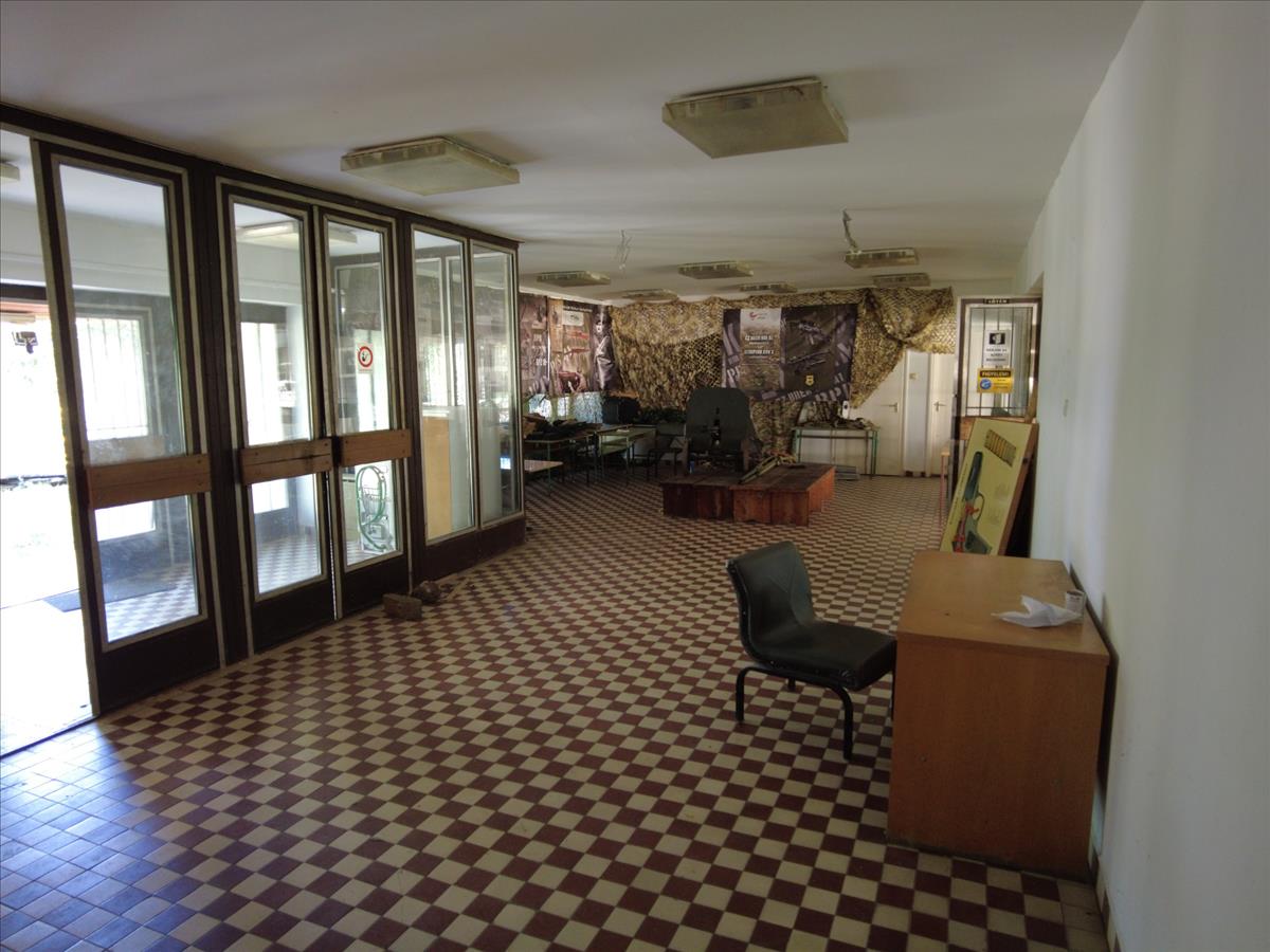 Az egy emeletes, lapos tetős főépület földszintjén találhatók az energetikailag leválasztott, gondnoki lakás, raktár, mesteri szoba, férfi, női mellékhelységek, takarítószer raktár, férfi- női öltözők zuhanyzókkal. a földszinti aulából lehet megközelíteni a félig nyitott, 25 db fedett lőállással rendelkező 50 m-es puska-pisztoly lőteret.
