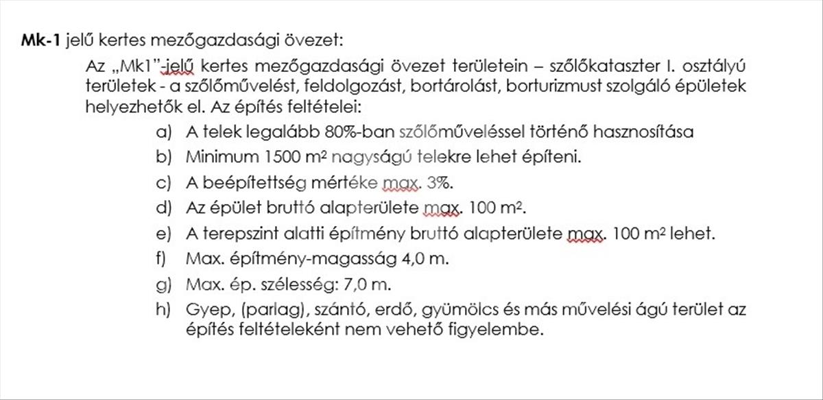Az „Mk1”-jelű kertes mezőgazdasági övezet területein – szőlőkataszter i. Osztályú területek - a szőlőművelést, feldolgozást, bortárolást, borturizmust szolgáló épületek helyezhetők el.