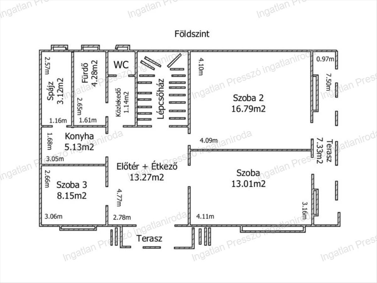 - az előtérből/étkezőből nyílik 3 szoba, fürdőszoba (zuhanyzóval felszerelt), konyha, wc és a lépcsőház