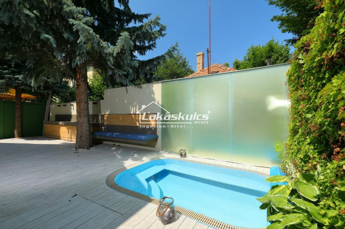 A hátsókertben télikonyha, terasz, valamint egy kis medence.