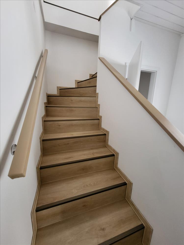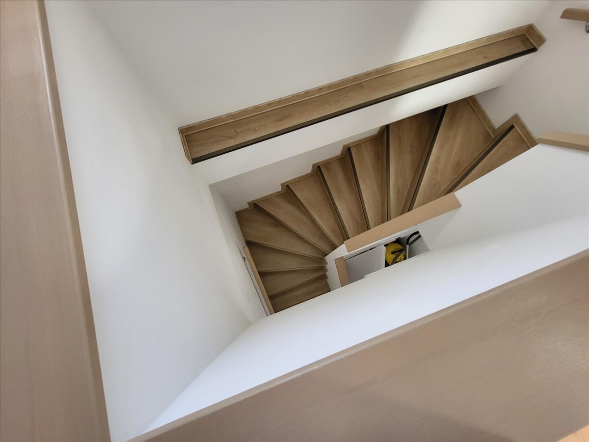 Az ingatlan belső két szintes, a földszinten található a nyugati tájolású nappali (33 nm ), a déli tájolásának köszönhetően nagyon világos konyha és a keleti tájolású tusolóval és WC-vel felszerelt fürdőszoba (5, 6 nm ). Ugyan itt van egy lépcső alatti tároló, továbbá az előszobából nyíló gépészeti helység. Hatalmas üvegfelületei redőnnyel felszereltek. Az emeleten az „l”- alakú közlekedőből nyílik minden. a nagy hálószoba nyugati, a kis hálószoba déli, a közlekedő és a fürdő keleti tájolású.