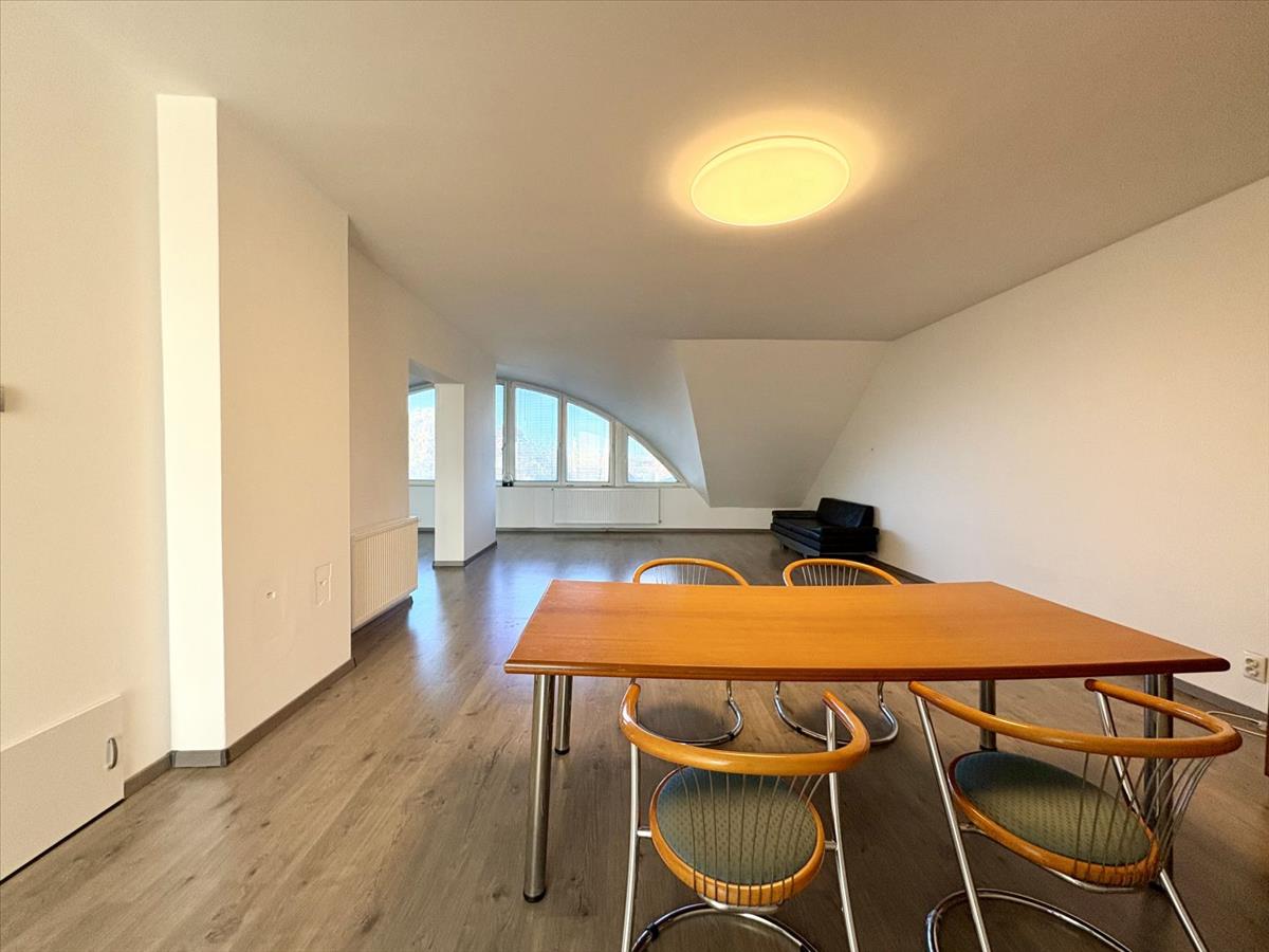 The ground floor currently houses a 140 m² commercial space, while the first floor has been converted into a spacious, bright home with a living room and three bedrooms. The attic also houses a 140 sqm commercial space. The three levels have separate entrances, so their functions can be completely separated and used flexibly.