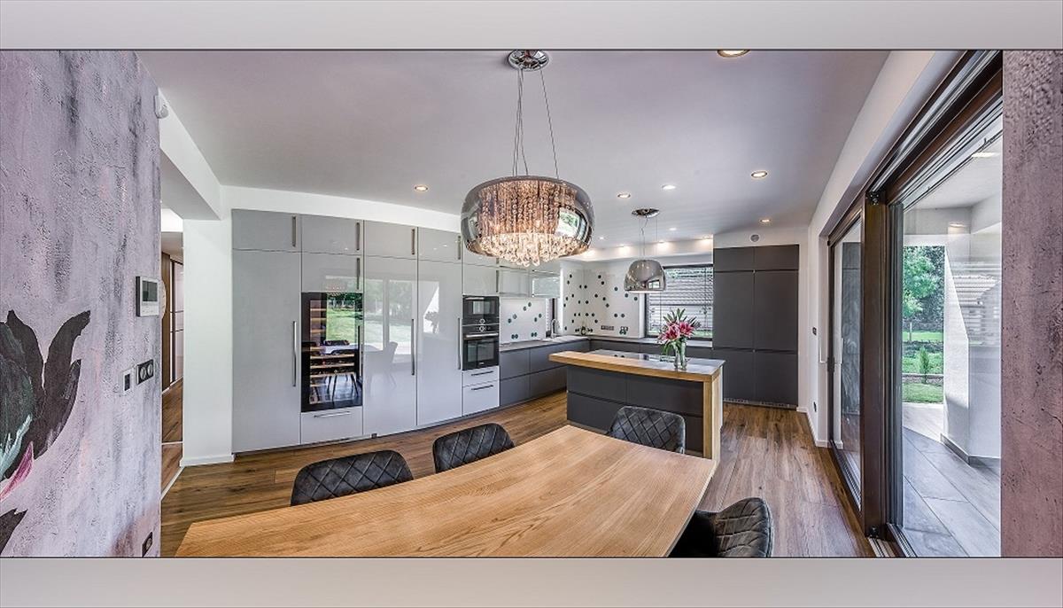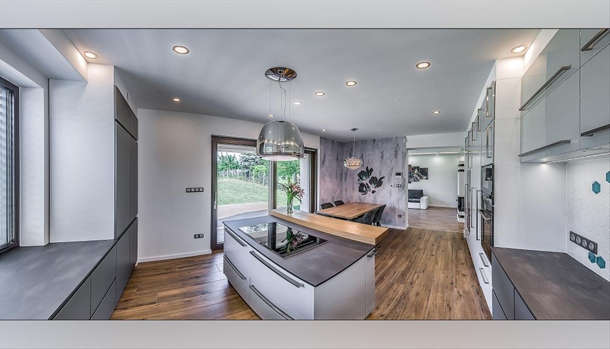 A nappaliból nyílik az étkező és a magas minőségű gépekkel felszerelt modern konyha (Bosch és Elica), amely minden igényt kielégít. a konyhából közvetlen kijárás biztosított a teraszra és a gondozott kertbe. a földszinten kamra és vendég wc is helyet kapott.