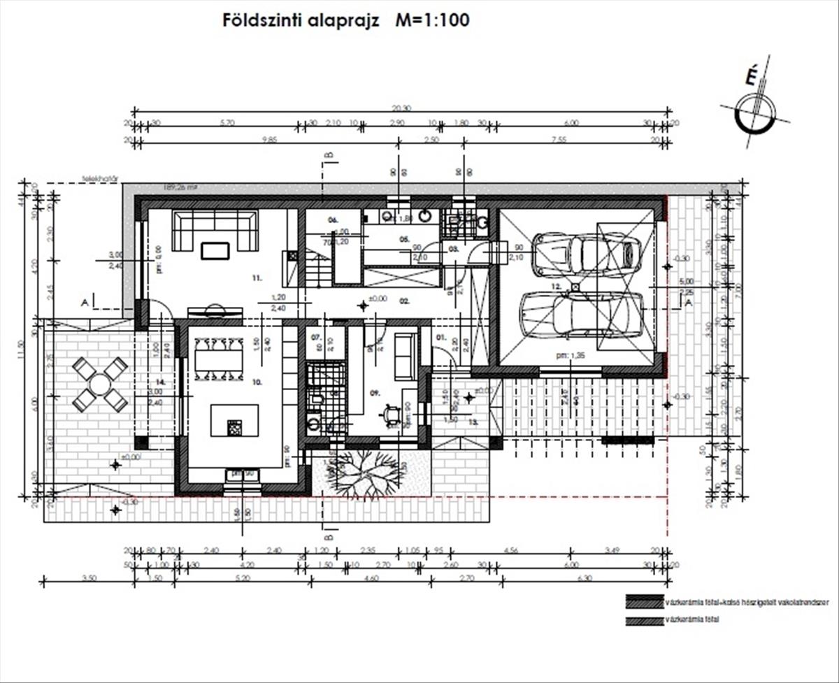 A kétállásos, 36 m²-es garázs elektromos kapuval és elektromos autótöltési lehetőséggel felszerelt. a gépészet külön helyiségben kapott helyet.