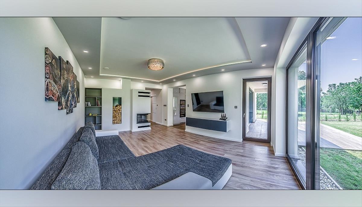 A ház központi eleme a tágas, napfényes nappali, amely közvetlen teraszkapcsolattal rendelkezik, és egy hangulatos, beépített kandalló teszi igazán otthonossá.