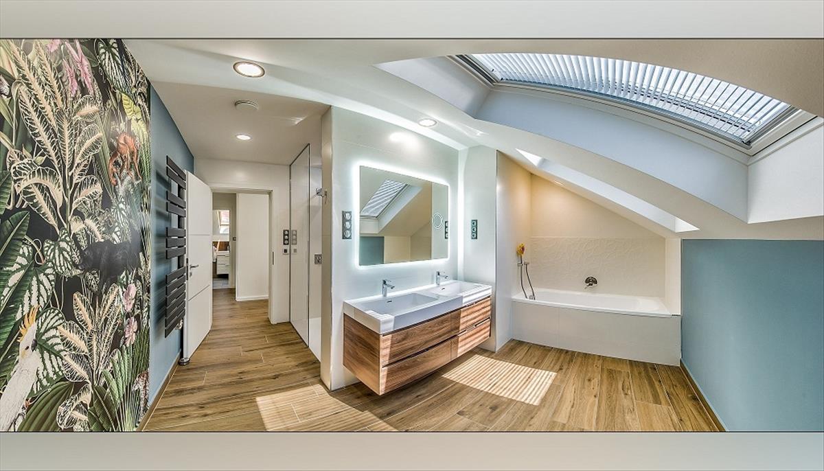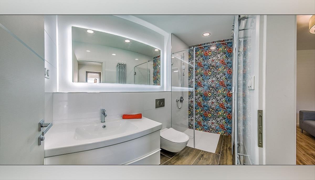 A fürdőszoba káddal és nagyméretű zuhanyzóval felszerelt, a kényelmet pedig modern, Bluetooth-os tükör egészíti ki.
