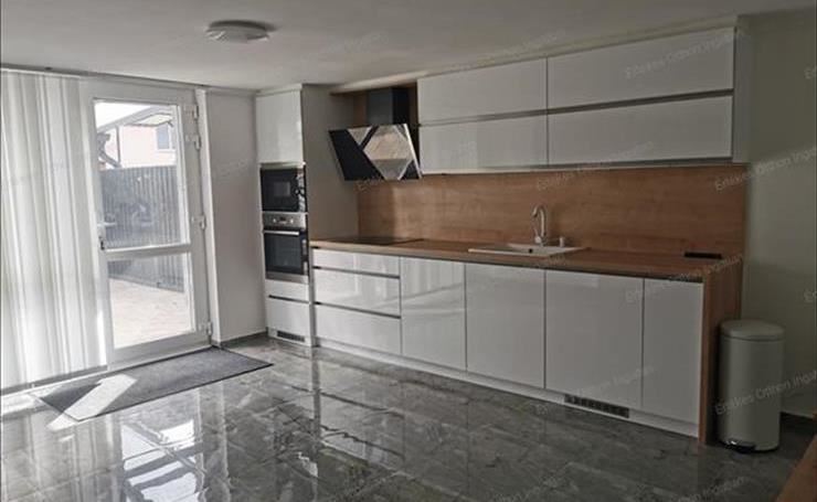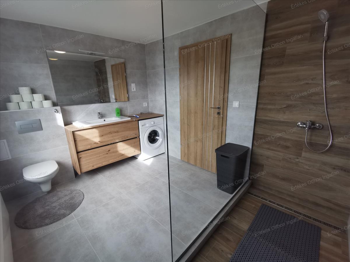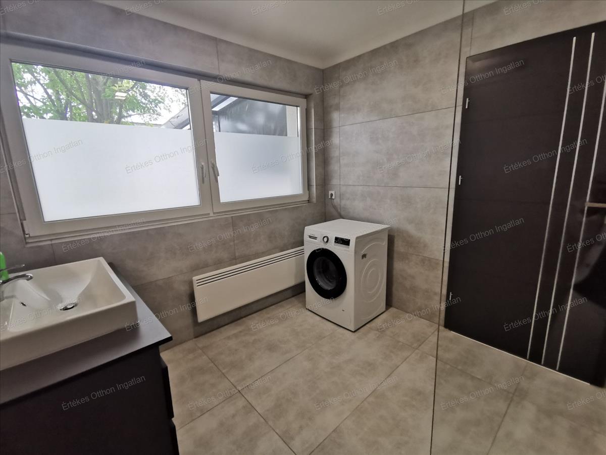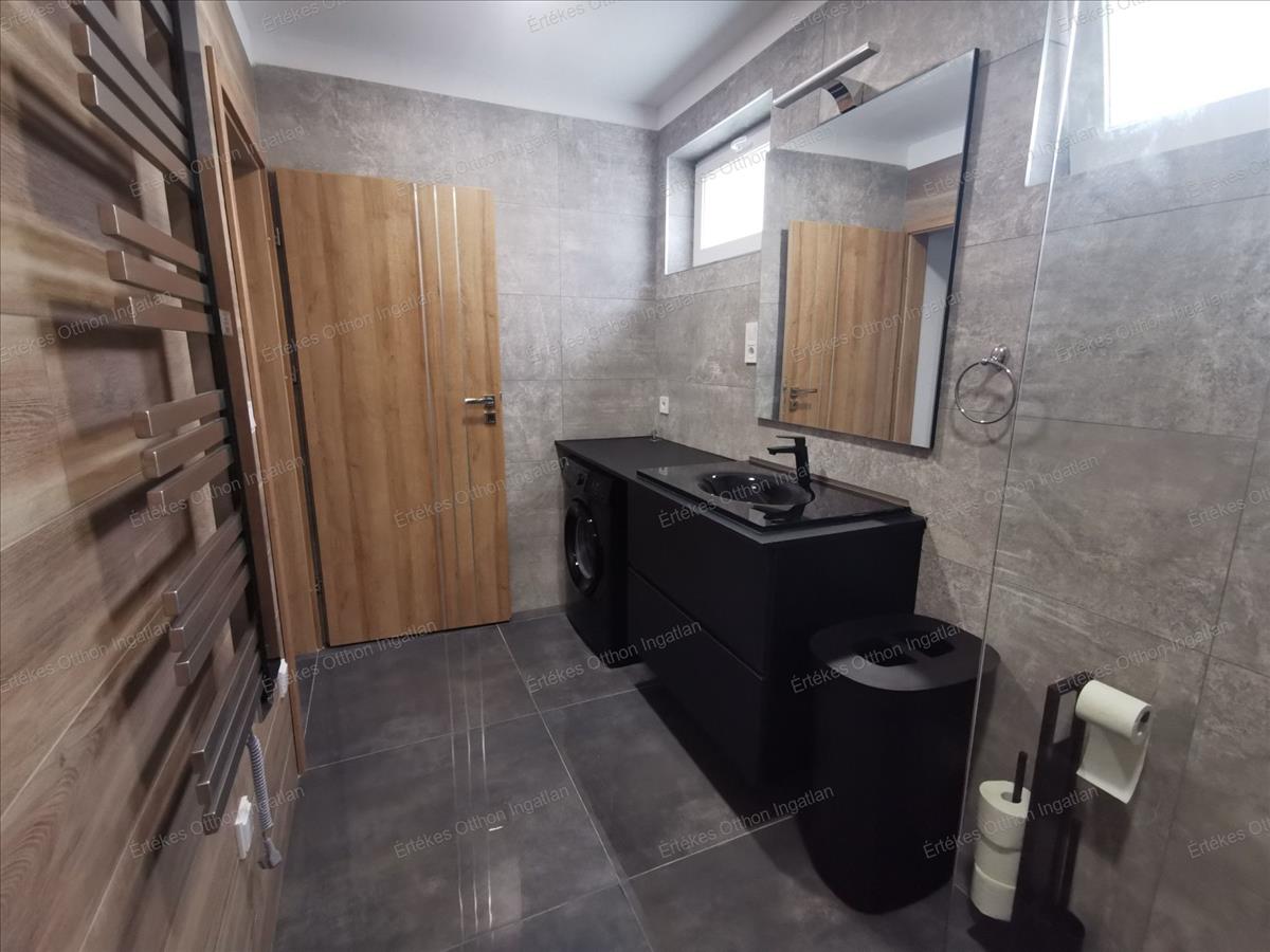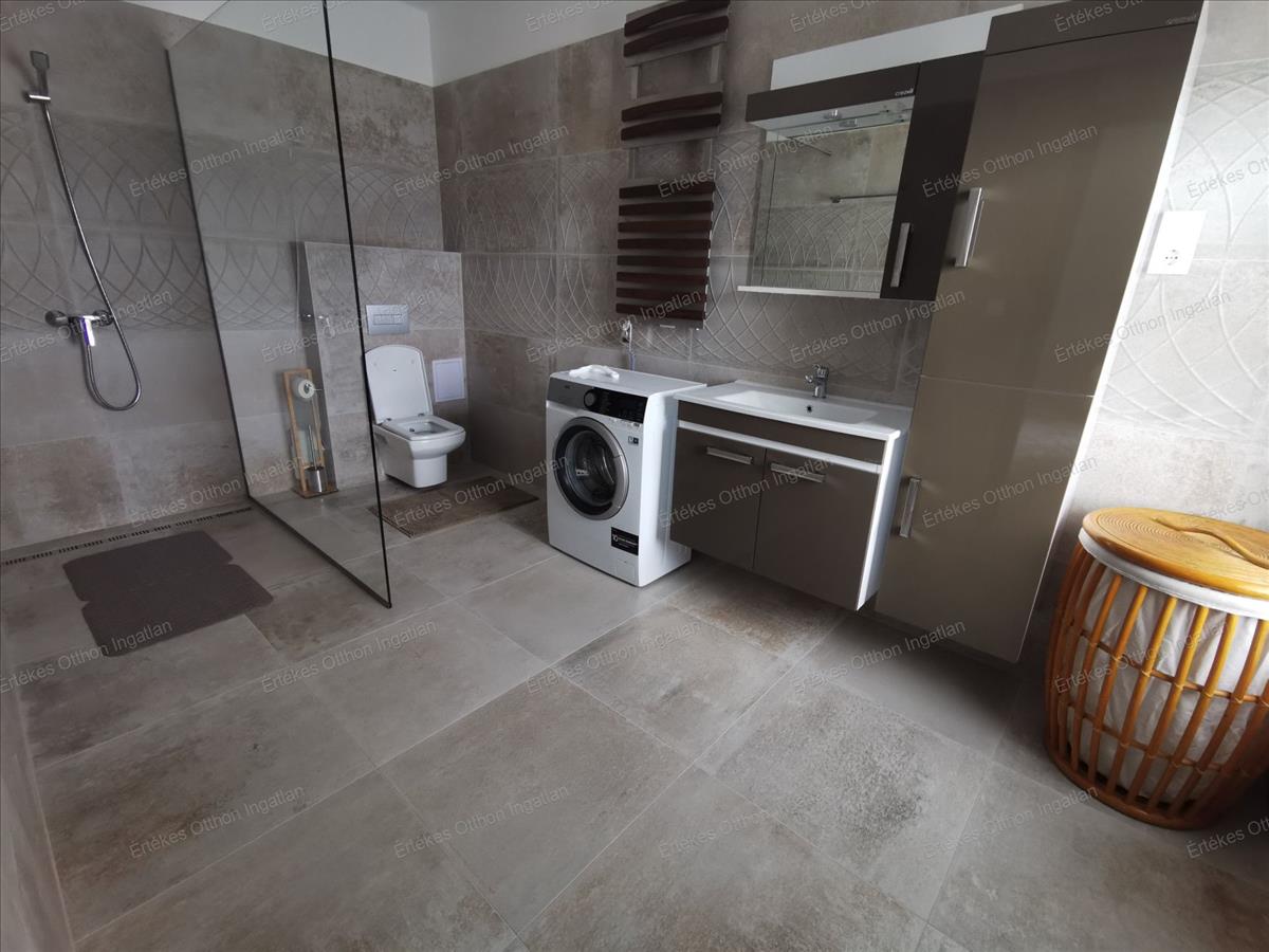 Exkluzív burkolatok, és szaniterek, minőségi épületgépészeti technológiák, valamint igényes, bútorokkal, és konyhai gépekkel, mosógéppel felszerel, letisztult, világos, ház.