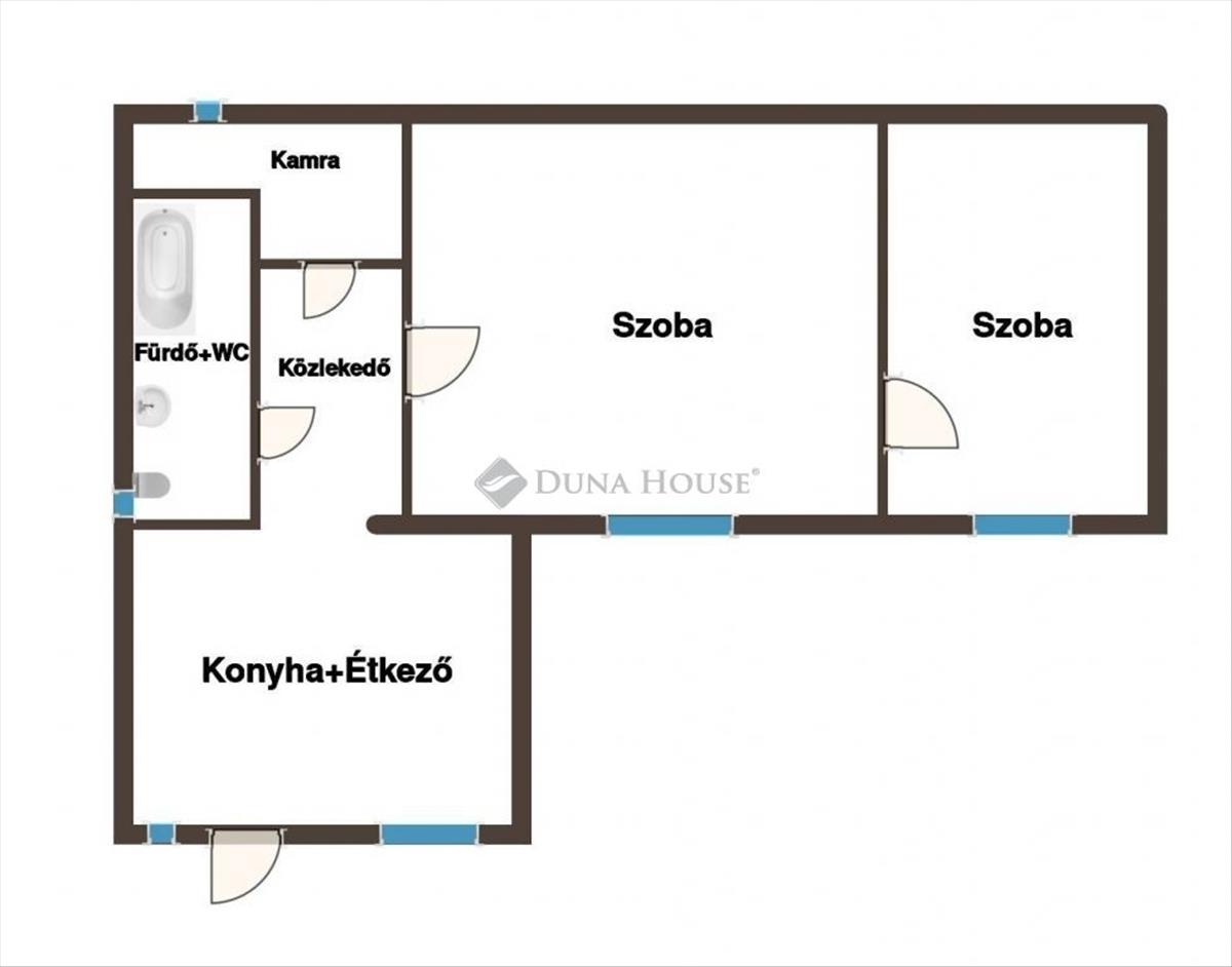 Elosztás: 2 világos szoba, konyha, kamra, fürdőszoba és WC.