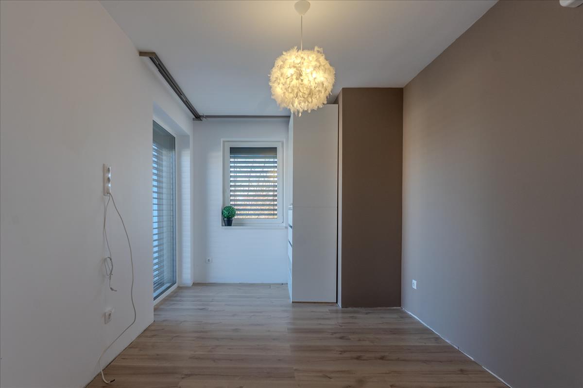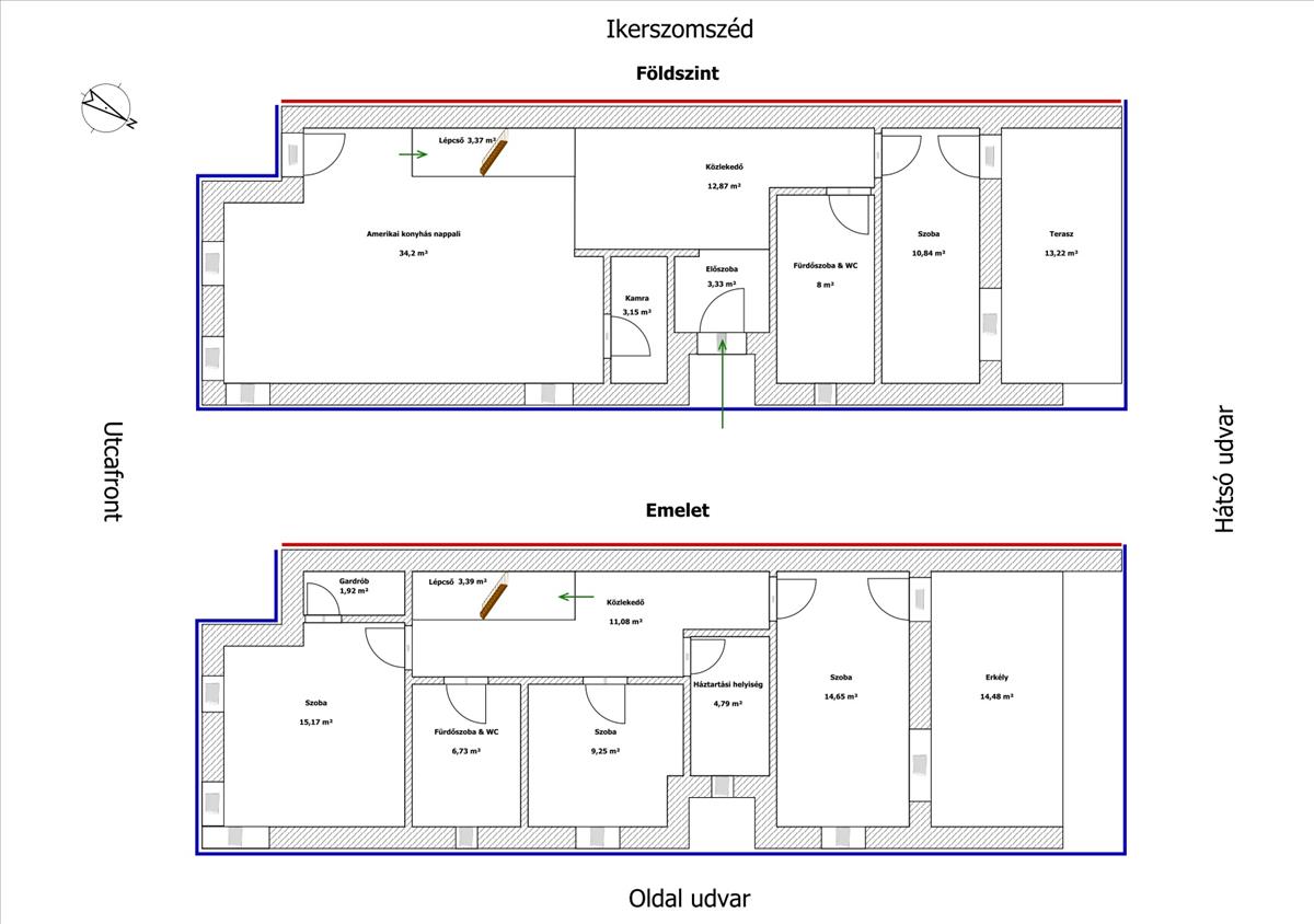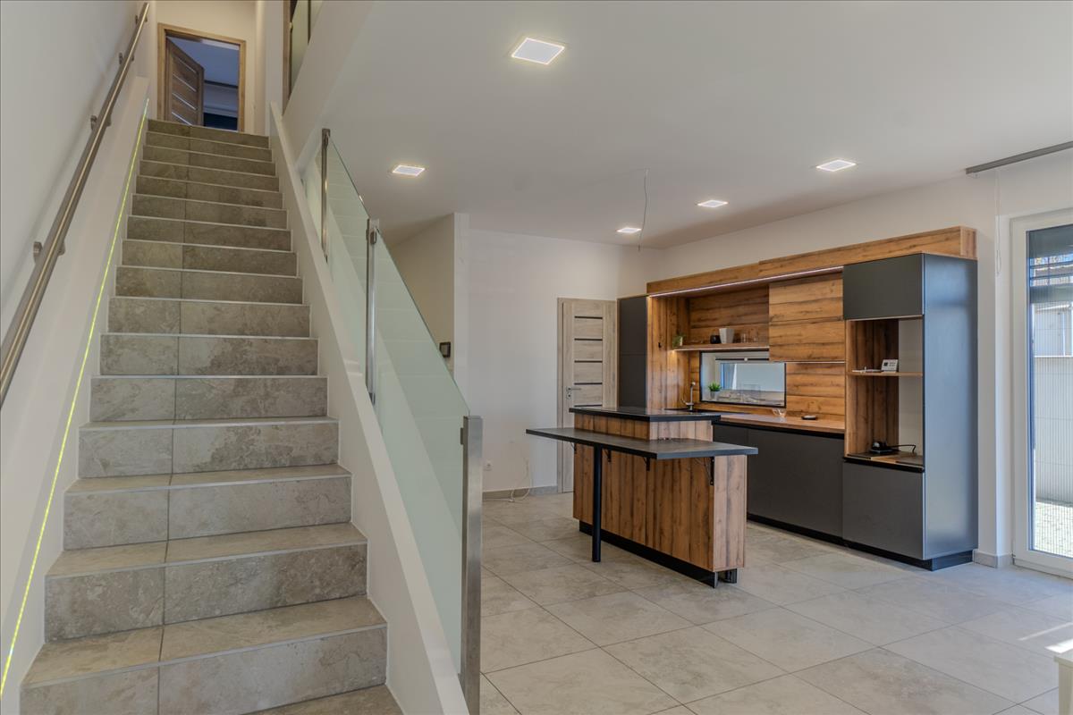 A földszinten tágas, világos amerikai konyhás nappali biztosítja a családi élet központját, közvetlen terasz- és kertkapcsolattal. Ezen a szinten egy hálószoba, fürdőszoba és kamra is helyet kapott.