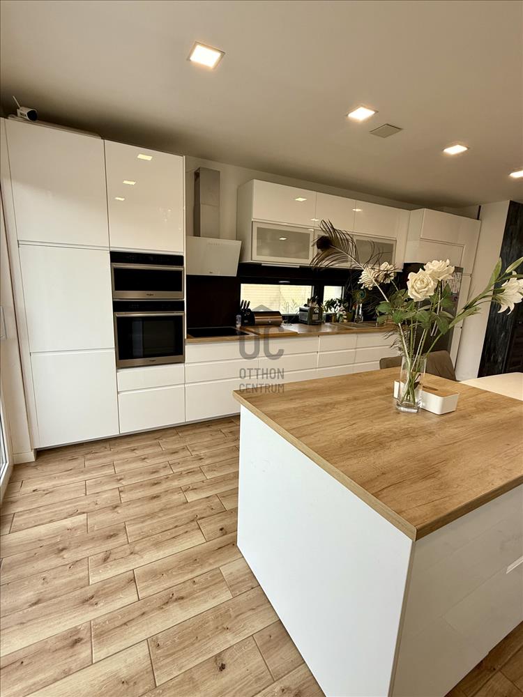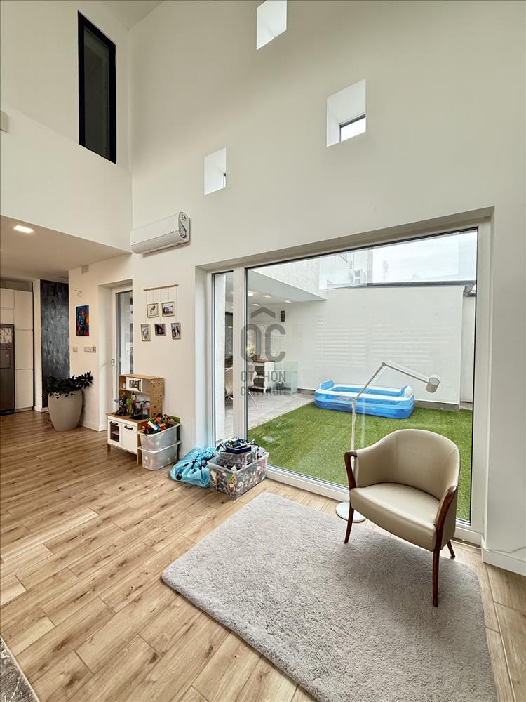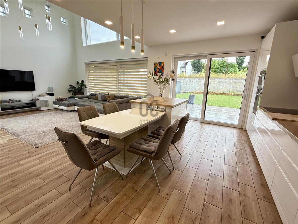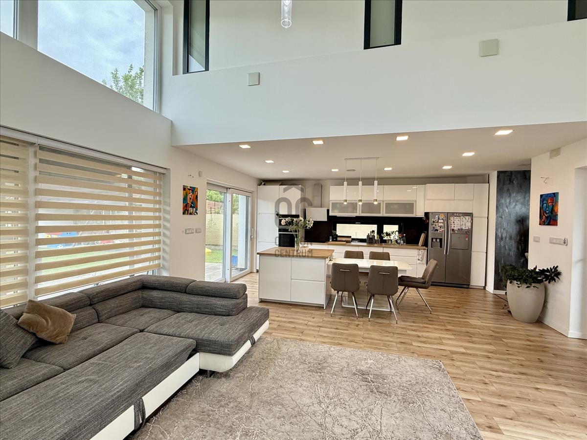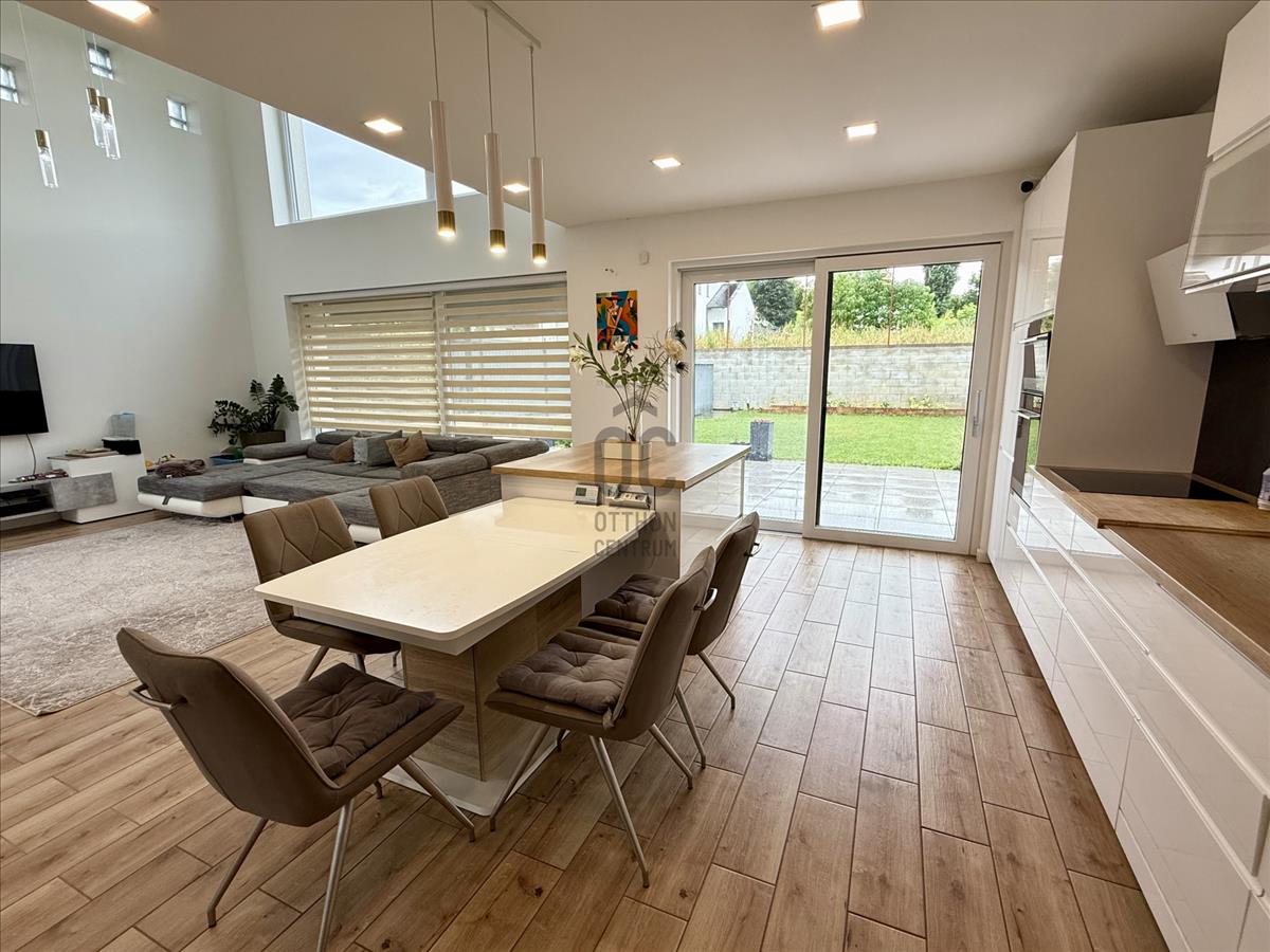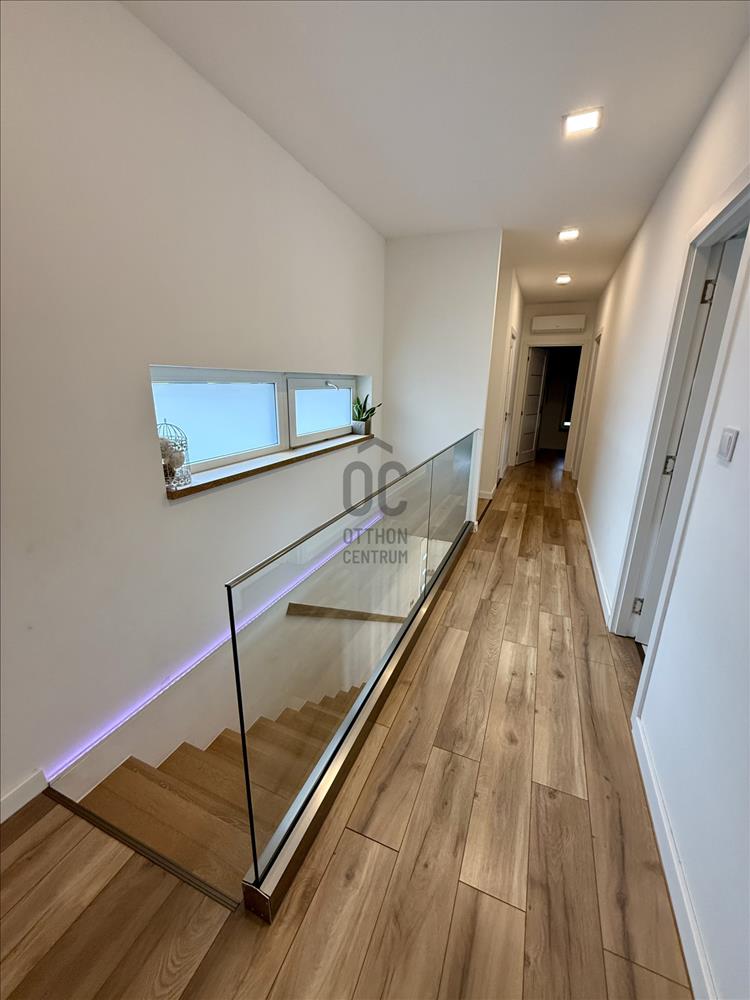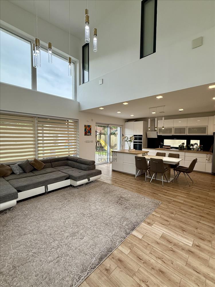 Az átgongolt kialakítású, 2021-ben épült, kétszintes ikerház tágas, nagy belmagasságú amerikai-konyhás nappalija, hatalmas üvegfelületei különleges hangulatú otthont teremtenek.