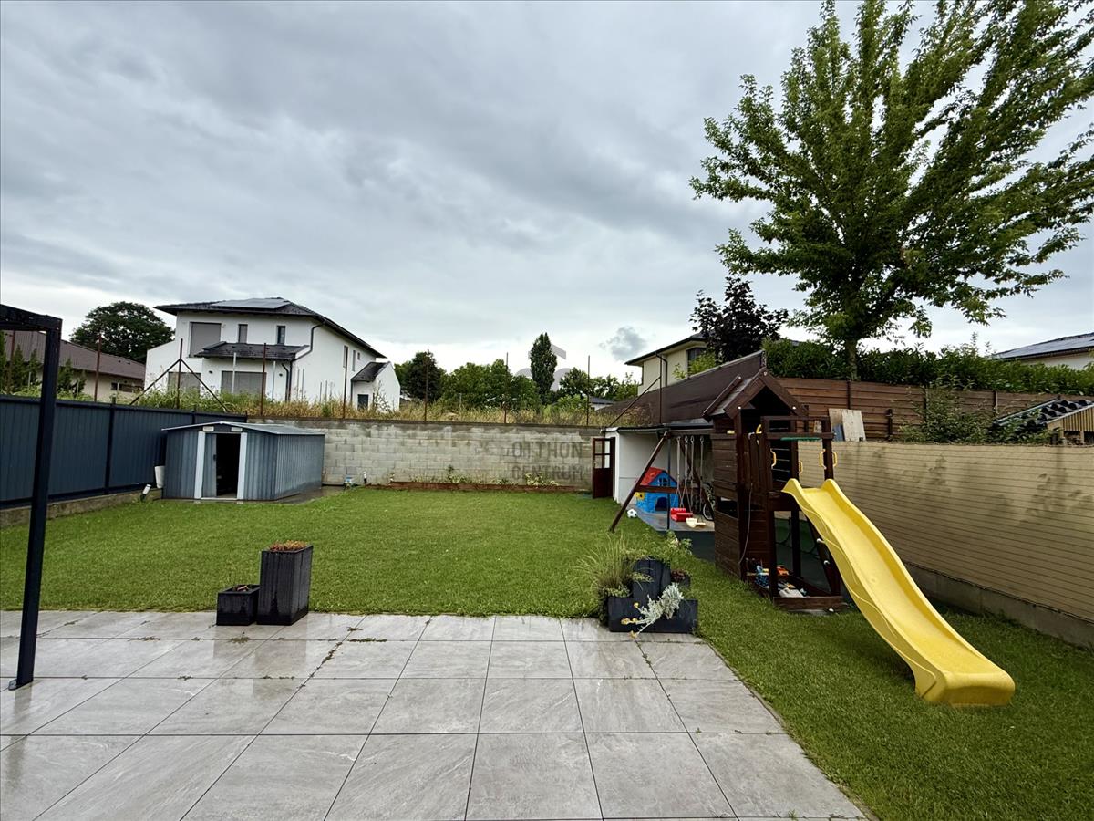 A különleges beosztású ház nappalija két irányban is kertkapcsolatos, az egyik belső átriumos, intim, és minden időjárásban praktikusan használható mert félig fedett, míg a ház mögött egy terasz kapcsolatos nagyobb kert került kialakításra, ahol még egy kis játszótér is helyet kapott. Automata öntözőrendszer gondoskodik a szép zöld kert fenntartásáról, míg a kerti tároló praktikus megoldást kínál a kinti eszközök és bútorok tárolására. Az elektromos autó töltés lehetősége is adott, így a környezettudatos életmód híveinek is ideális megoldást nyújt.