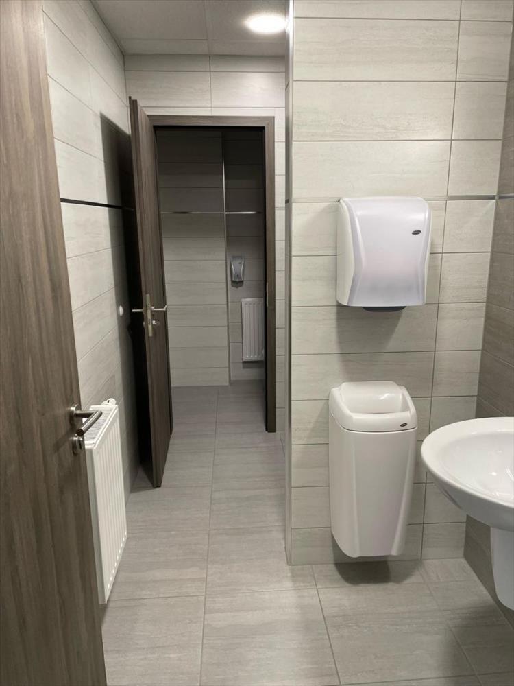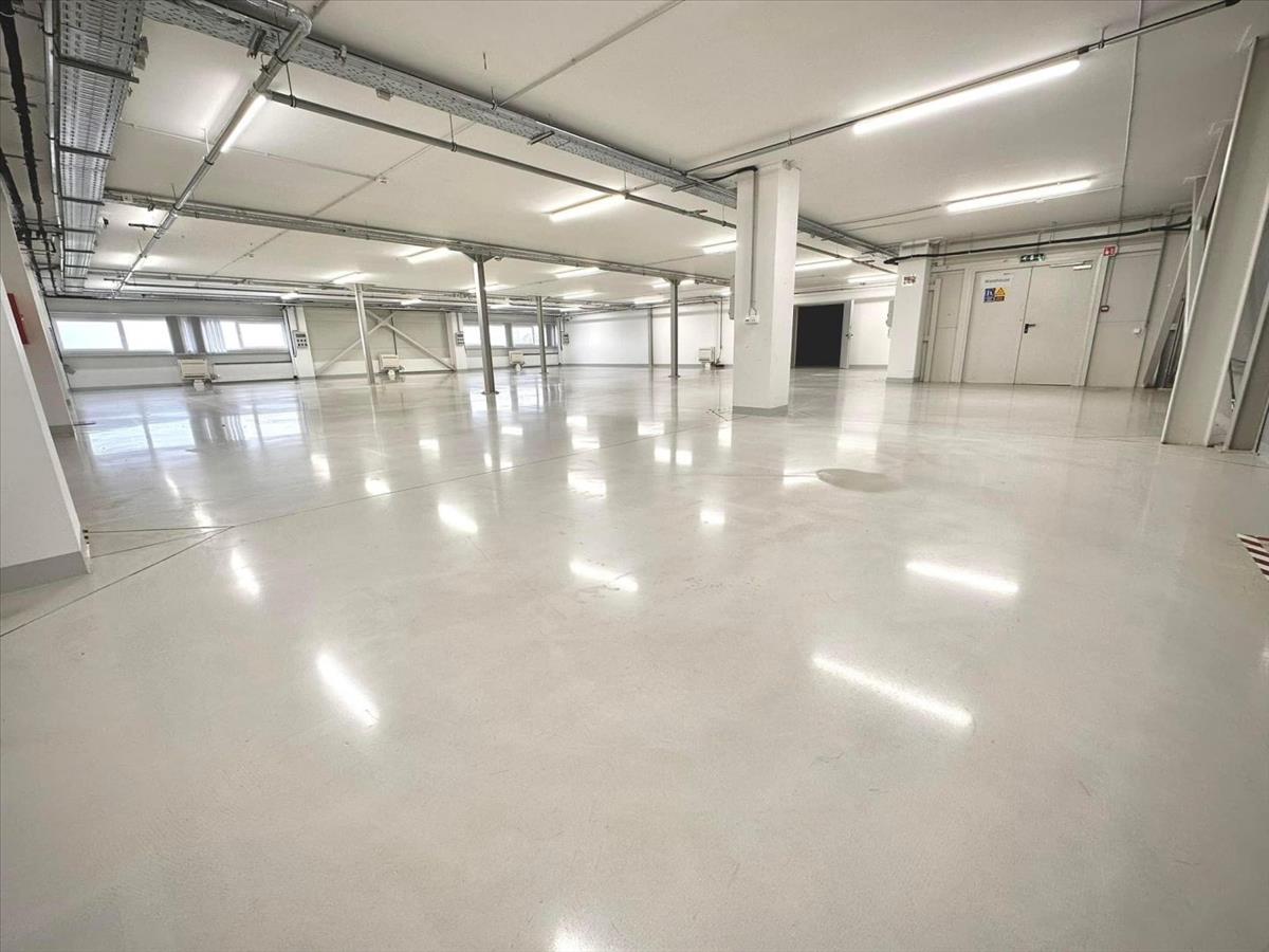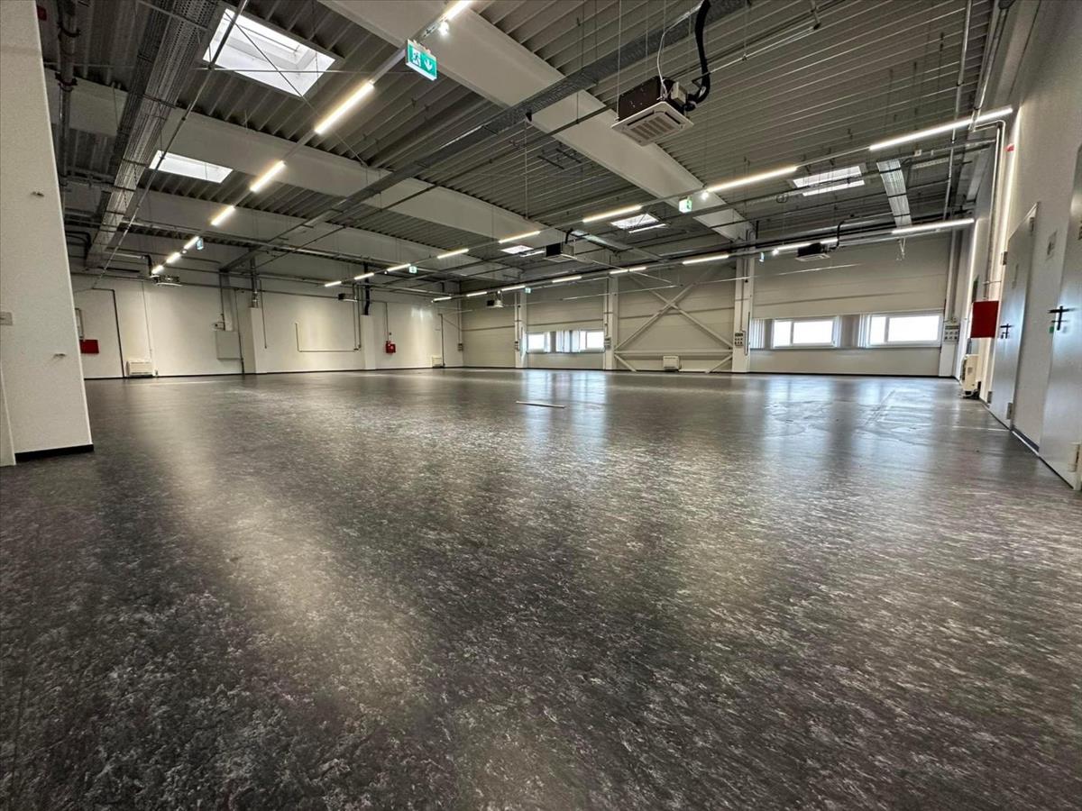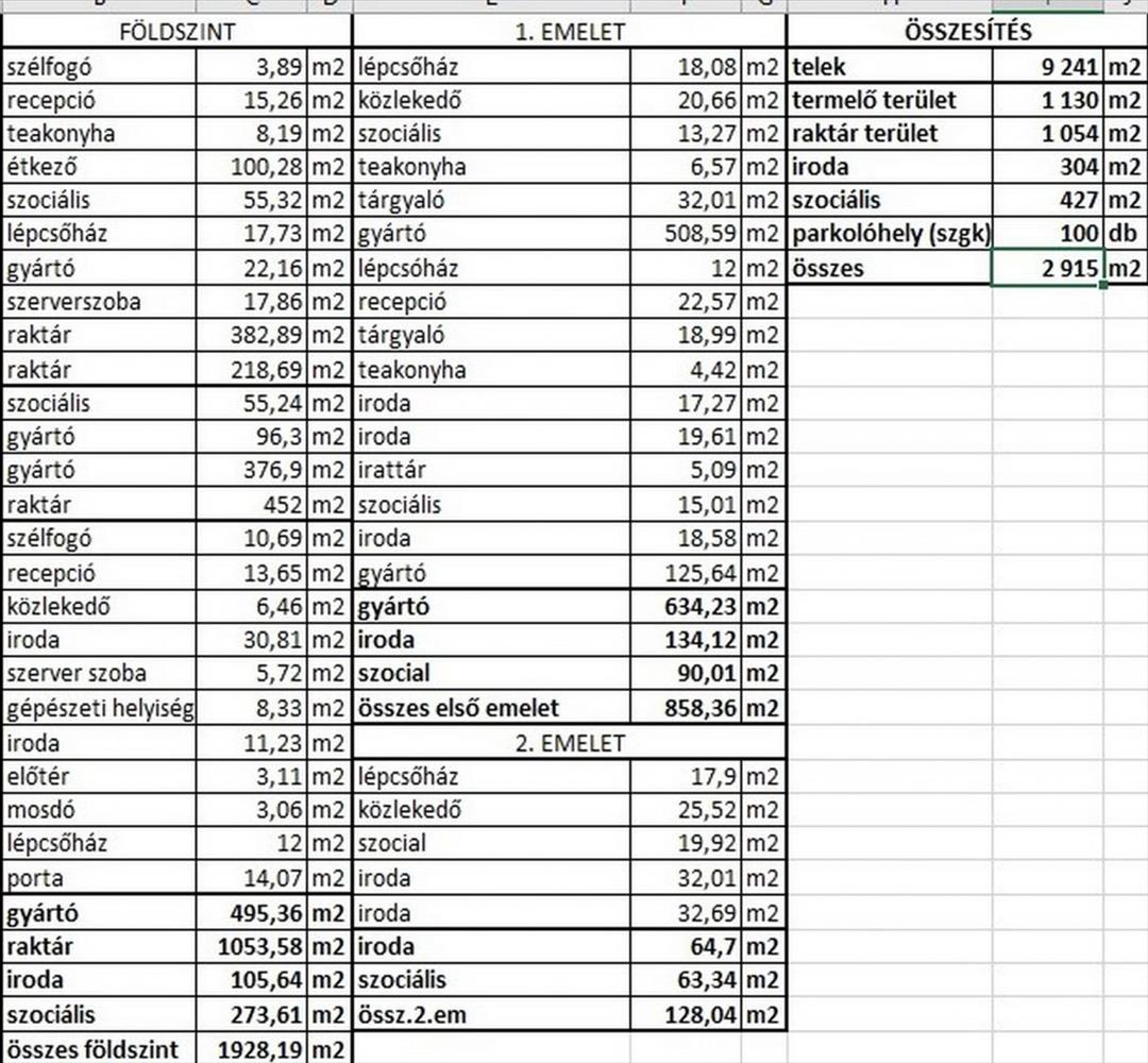 A 2. 915 m2-es felépítmény földszinti kisebb részén (380m2) irodák és a dolgozók kiszolgálását biztosító szociális helyiségek találhatóak. a földszint nagyobb részét pedig 6 t/m2 padlóterhelhetőségű 2, 8 m belmagasságú 495 m2-es, esd padlóval ellátott gyártó, valamint a szintén 6 t/m2 padlóterhelhetőségű 8 m belmagasságú 1053 m2-es raktár csarnok foglalja el. a földszint a személyi bejáratokon kívül 4 db, 4m x 4, 5m-es szintbeni szekcionált Hörmann ipari kapun keresztül közelíthető meg.