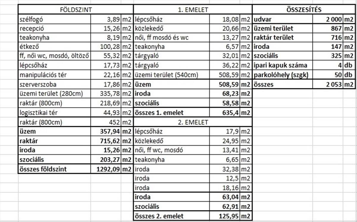 A 2 053 m2-es felépítmény földszinti részén a dolgozók kiszolgálását biztosító szociális helyiségek találhatóak, aminek egy része igény szerint irodaként, tárgyalóként is használható. a földszint nagyobb részét pedig 6 t/m2 padlóterhelhetőségű 2, 8 m belmagasságú 335 m2-es, esd padlóval ellátott gyártó, valamint a szintén 6 t/m2 padlóterhelhetőségű 8 m belmagasságú 716 m2-es raktár csarnok foglalja el. a földszint a személyi bejáratokon kívül 2 db, 4m x 4, 5m-es szintbeni szekcionált Hörmann ipari kapun keresztül közelíthető meg.