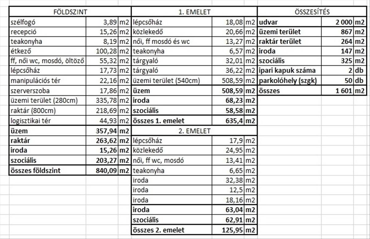 A 1 601 m2-es felépítmény földszinti részén a dolgozók kiszolgálását biztosító szociális helyiségek találhatóak, aminek egy része igény szerint irodaként, tárgyalóként is használható. a földszint nagyobb részét pedig 6 t/m2 padlóterhelhetőségű 2, 8 m belmagasságú 335 m2-es, esd padlóval ellátott gyártó, valamint a szintén 6 t/m2 padlóterhelhetőségű 8 m belmagasságú 264 m2-es raktár csarnok foglalja el. a földszint a személyi bejáratokon kívül 2 db, 4m x 4, 5m-es szintbeni szekcionált Hörmann ipari kapun keresztül közelíthető meg.