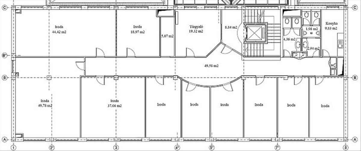 Jelenleg a szinten 11 külön, - a folyosóról nyíló iroda, - 1 db 12 fős befogadóképességű tárgyaló, - férfi és női mosdó és teakonyha található.