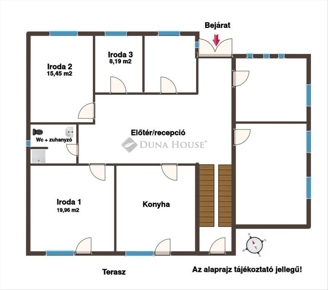 A jelenleg irodának kialakított helyiség 19, 96 m2-es. a szociális helyiségek közösek a szinten lévő bérlőkkel. a konyha terasz kapcsolattal is rendelkezik. Kialakítását tekintve alkalmas lehet irodának, rendelőnek, de akár üzletnek is. a fenti bérleti díjat még áfa terheli. Az udvarba 1 autó számára beállási lehetőség biztosított.