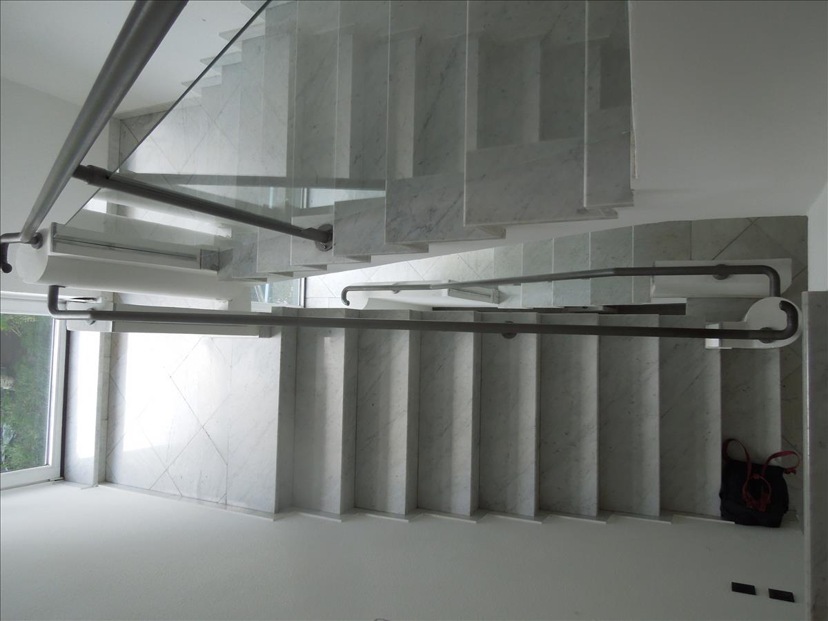 Padozat: elegáns carrarai fehér márvány belépő, padozat és lépcsőház, a szobákban parketta.