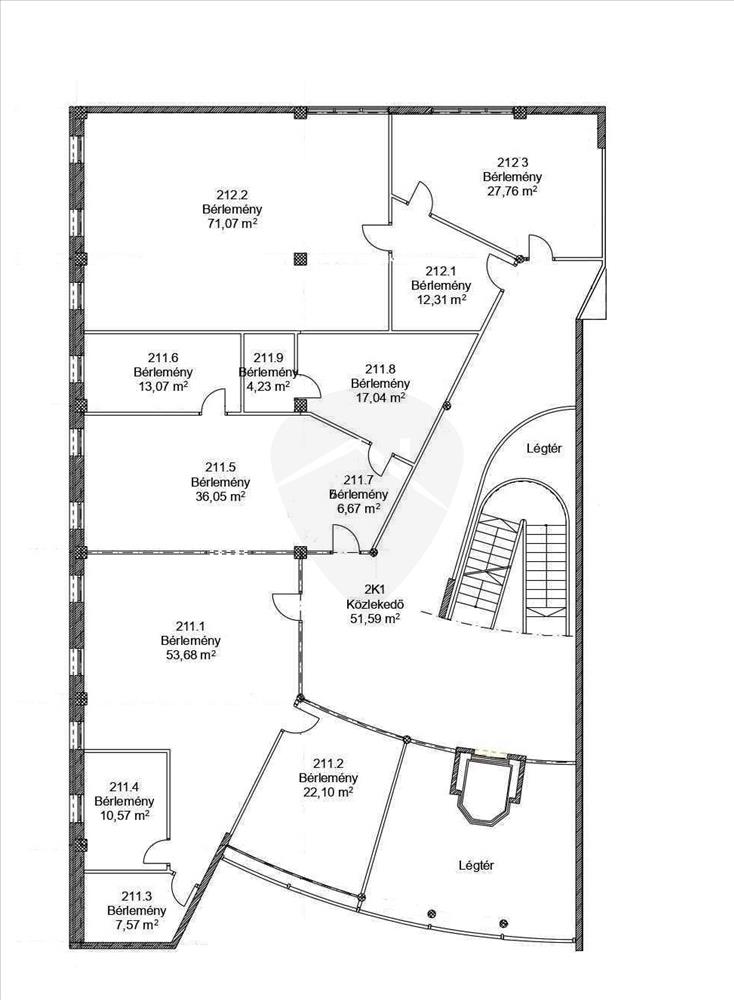 94 m2 helyiségcsoport, 3 m belmagassággal, jó beosztással, világos, déli és keleti tájolású ablakokkal, szeparált "főnöki" szobával/tárgyalóval, kis étkezővel, önálló, szagelszívási lehetőséggel kiépített teakonyhával (alaprajz: 211. 1 - 4 Jelölésű helyiségek)