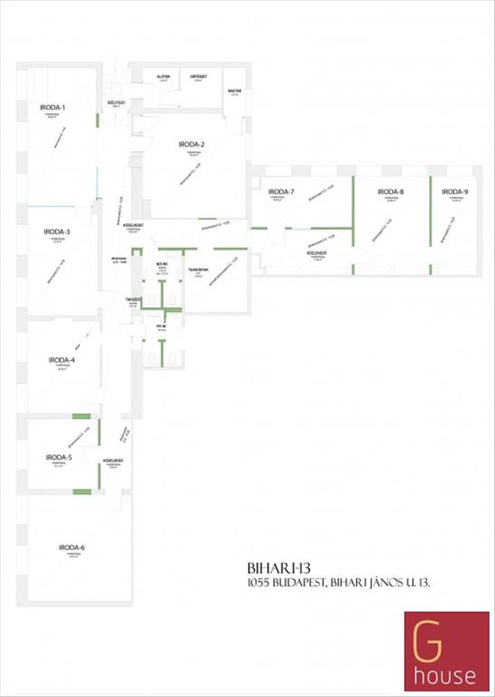 9 iroda, telekommunikációs szoba, felszerelt teakonyha, tágas közlekedőterek, valamint külön női és férfi mosdó található. a 13-34 m2 alapterületű irodák bútorozottan vagy bútorozatlanul is bérbe vehetők.