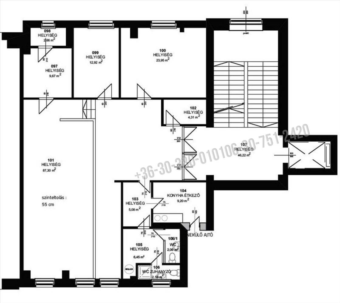 3 Külön 10, 12, 28 nm -es irodahelyiség + 87 nm -es egy nagy légterű iroda + teakonyha +férfi és női WC-tusoló, tároló található.