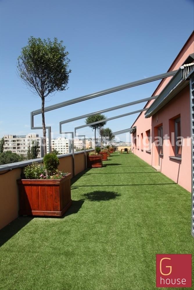 Gránittal és zöld részekkel burkolt udvar található az épület körül.