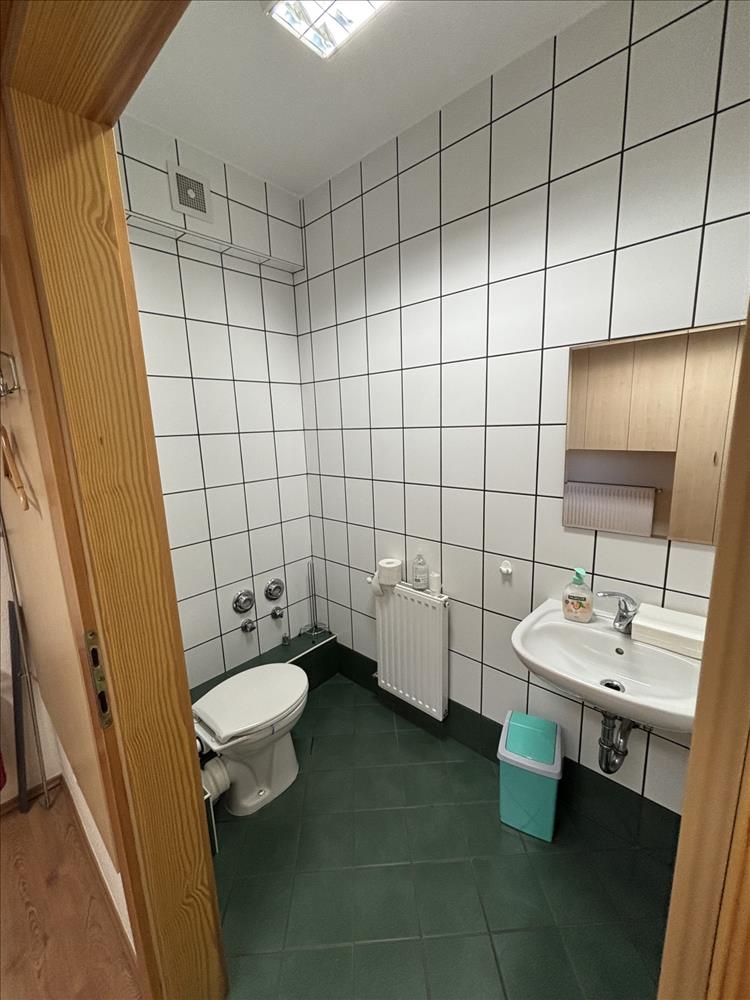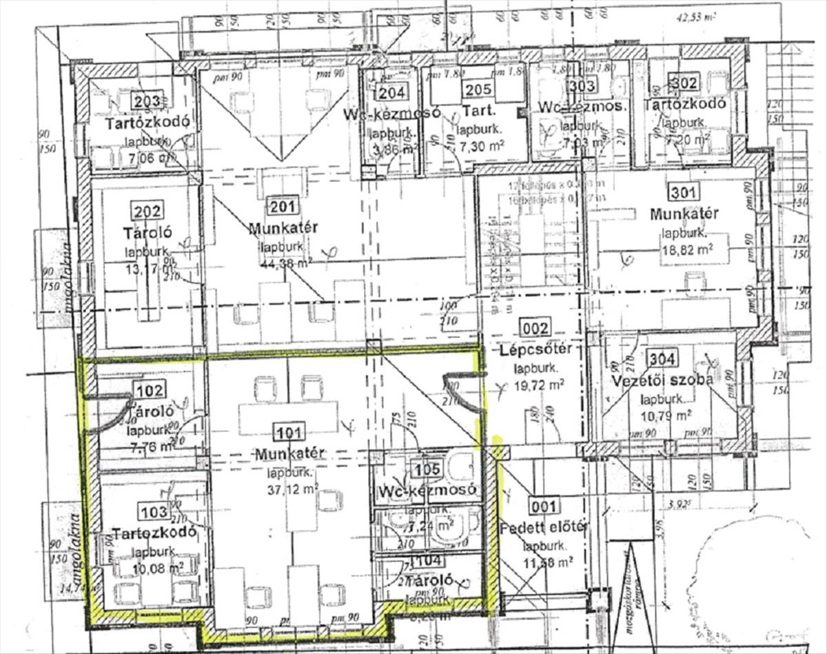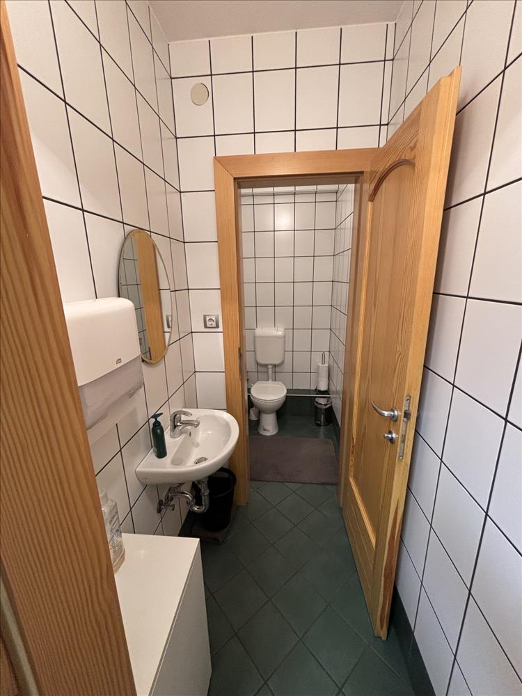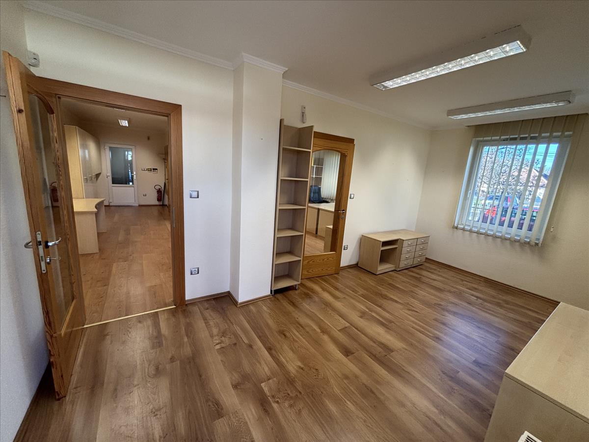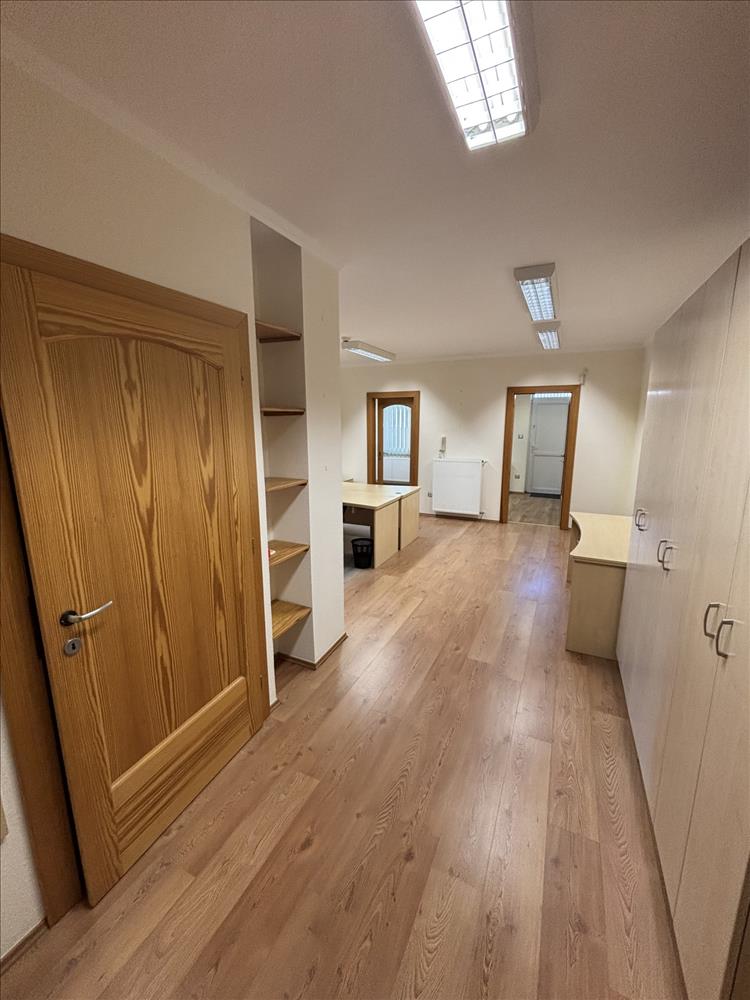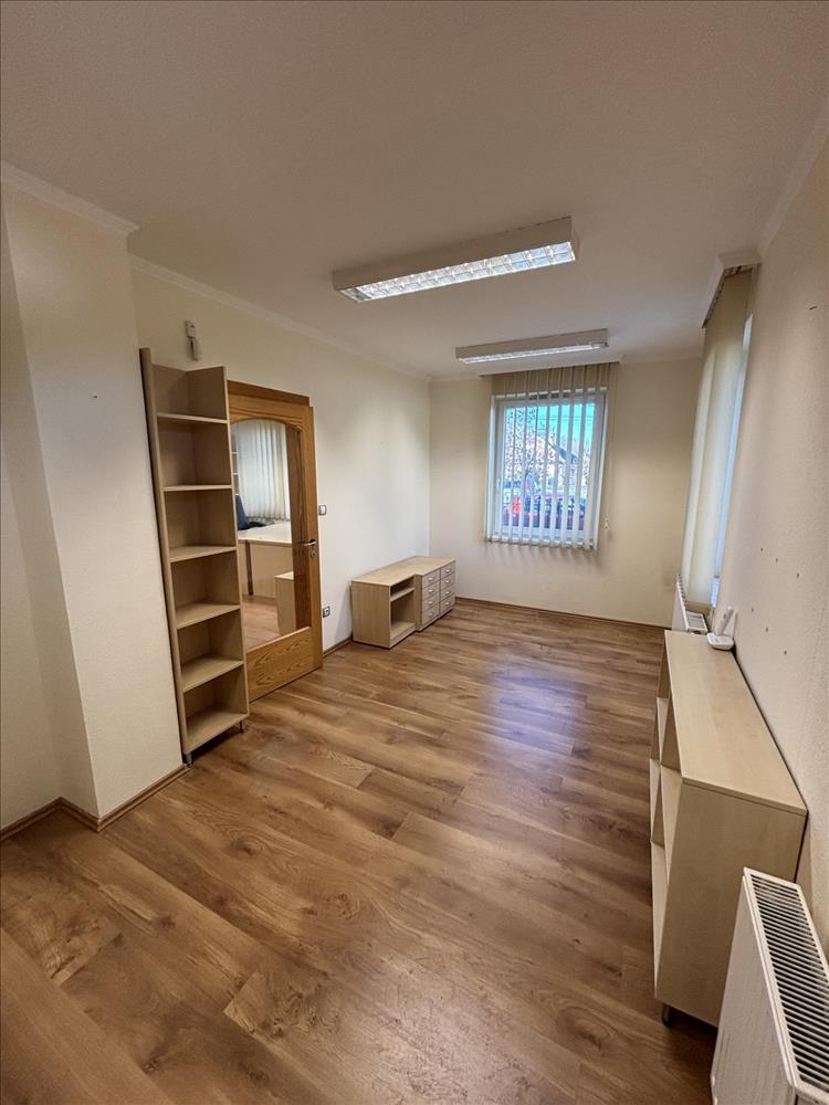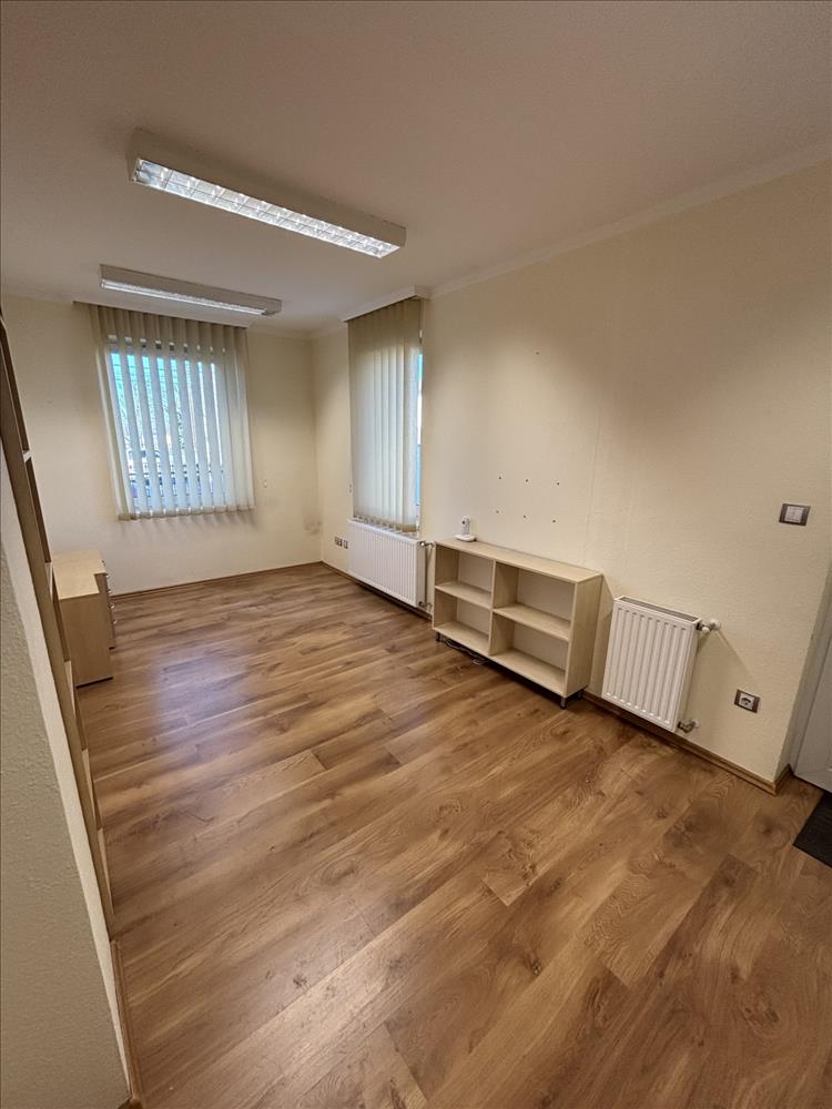 Az iroda 4-6 fő részére alkalmas, elosztása egy nagyobb irodarészből, egy vezetői helyiségből, konyhából, 2db mosdó helyiségből és 2db WC-ből áll. Két bejárata van, az egyik az irodaházból, a másik az udvarról.