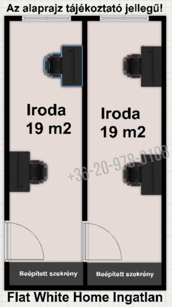 Az ingatlan kettő, közel egyforma nagyságú (19 m²-es), irodahelyiségből áll.