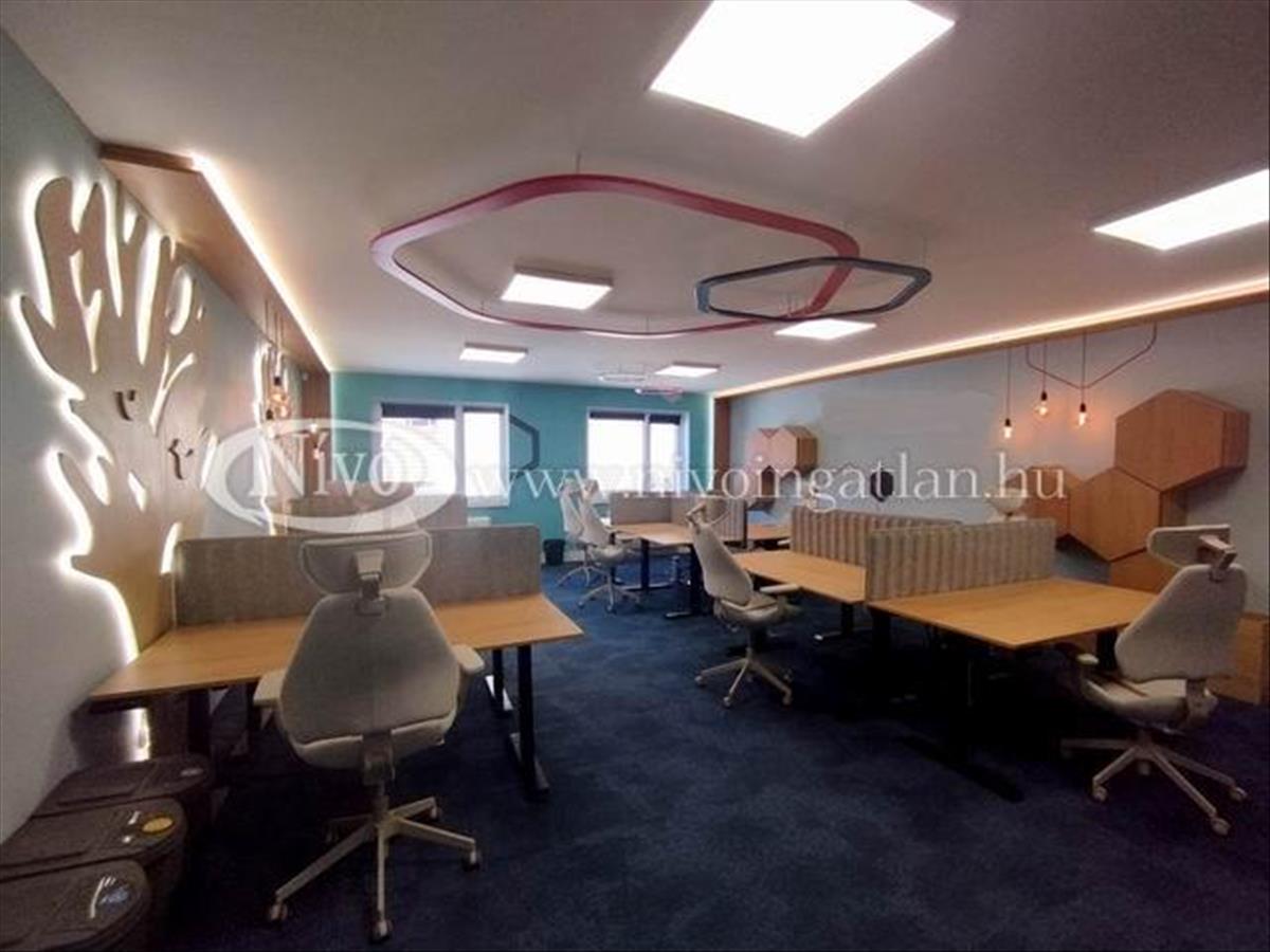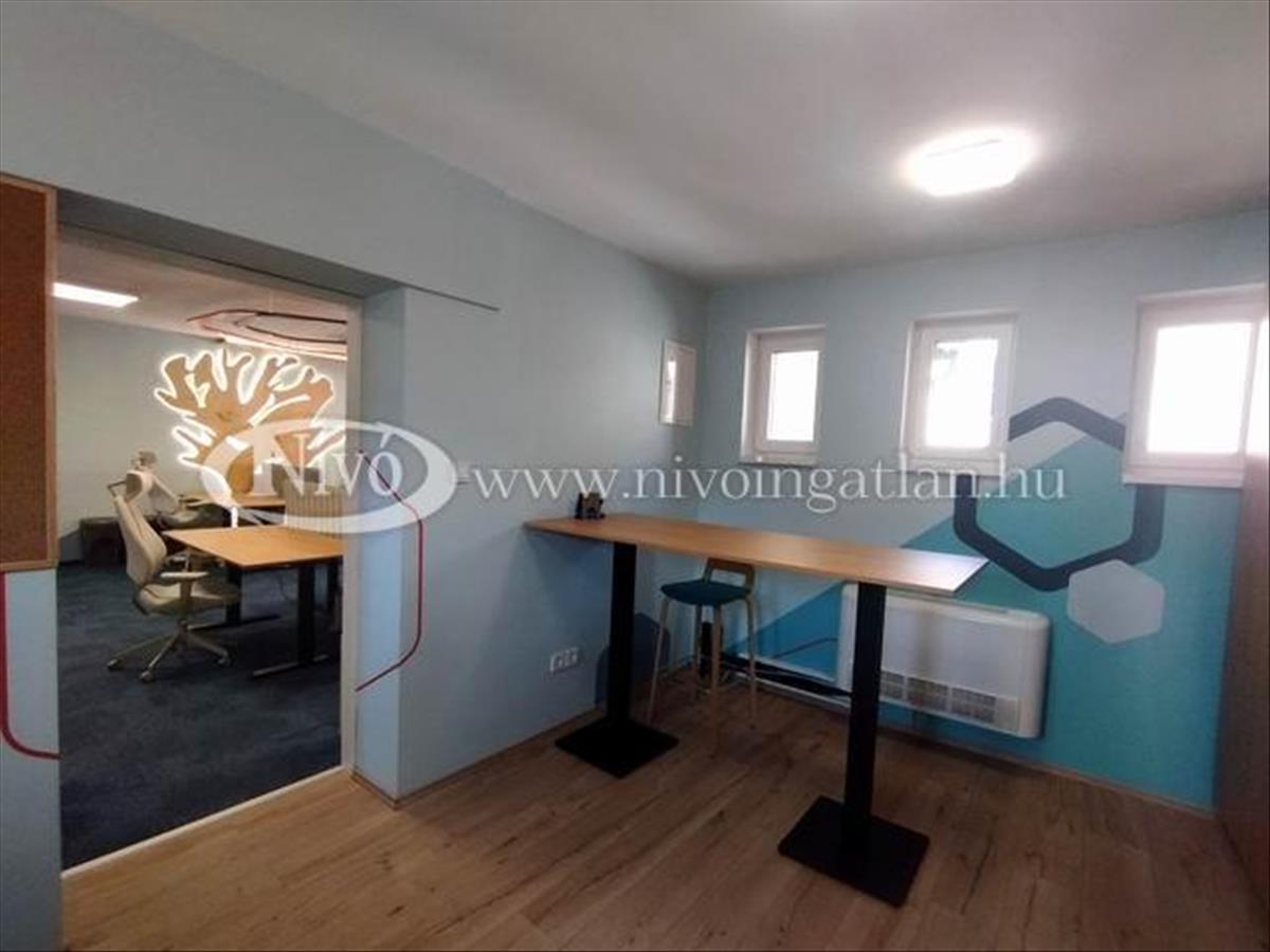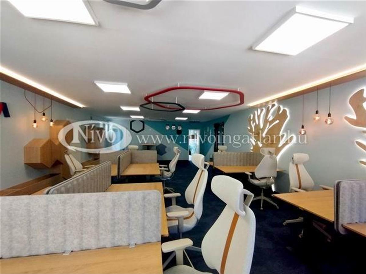 Az irodahelyiségben a berendezés illetve a kialakítás belső építész által tervezett és megvalósított, magas minőségű állítható számítógép asztalokkal és irodai székekkel, bútorokkal ellátott. Hangulatvilágításokkal megtervezett, rendezhető, jól átlátható szekrényekkel felszerelt. a 112 m2-es iroda egy nagy világos helyiségből, két tárgyalóból és egy beépített, felszerelt konyha-étkezőből áll.