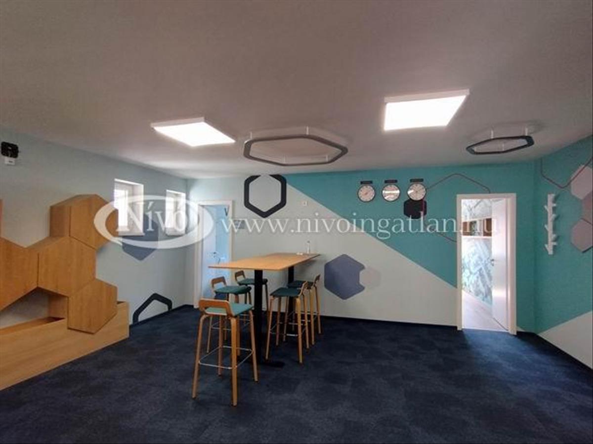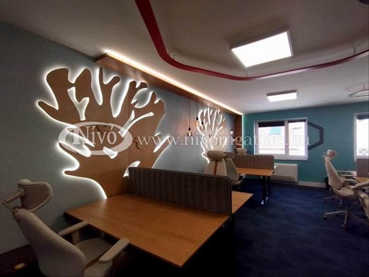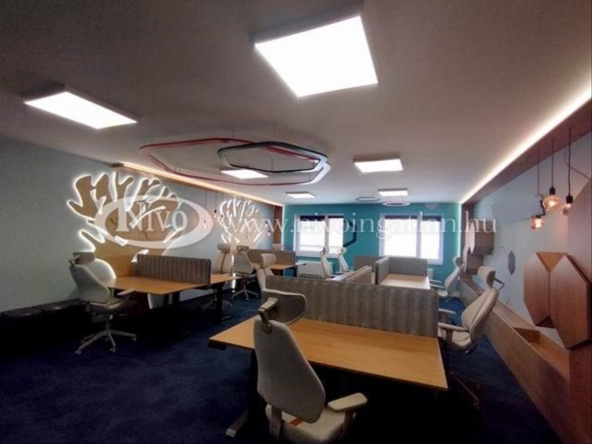Az irodahelyiségben a berendezés illetve a kialakítás belső építész által tervezett és megvalósított, magas minőségű állítható számítógép asztalokkal és irodai székekkel, bútorokkal ellátott. Hangulatvilágításokkal megtervezett, rendezhető, jól átlátható szekrényekkel felszerelt. a 112 m2-es iroda egy nagy világos helyiségből, két tárgyalóból és egy beépített, felszerelt konyha-étkezőből áll.