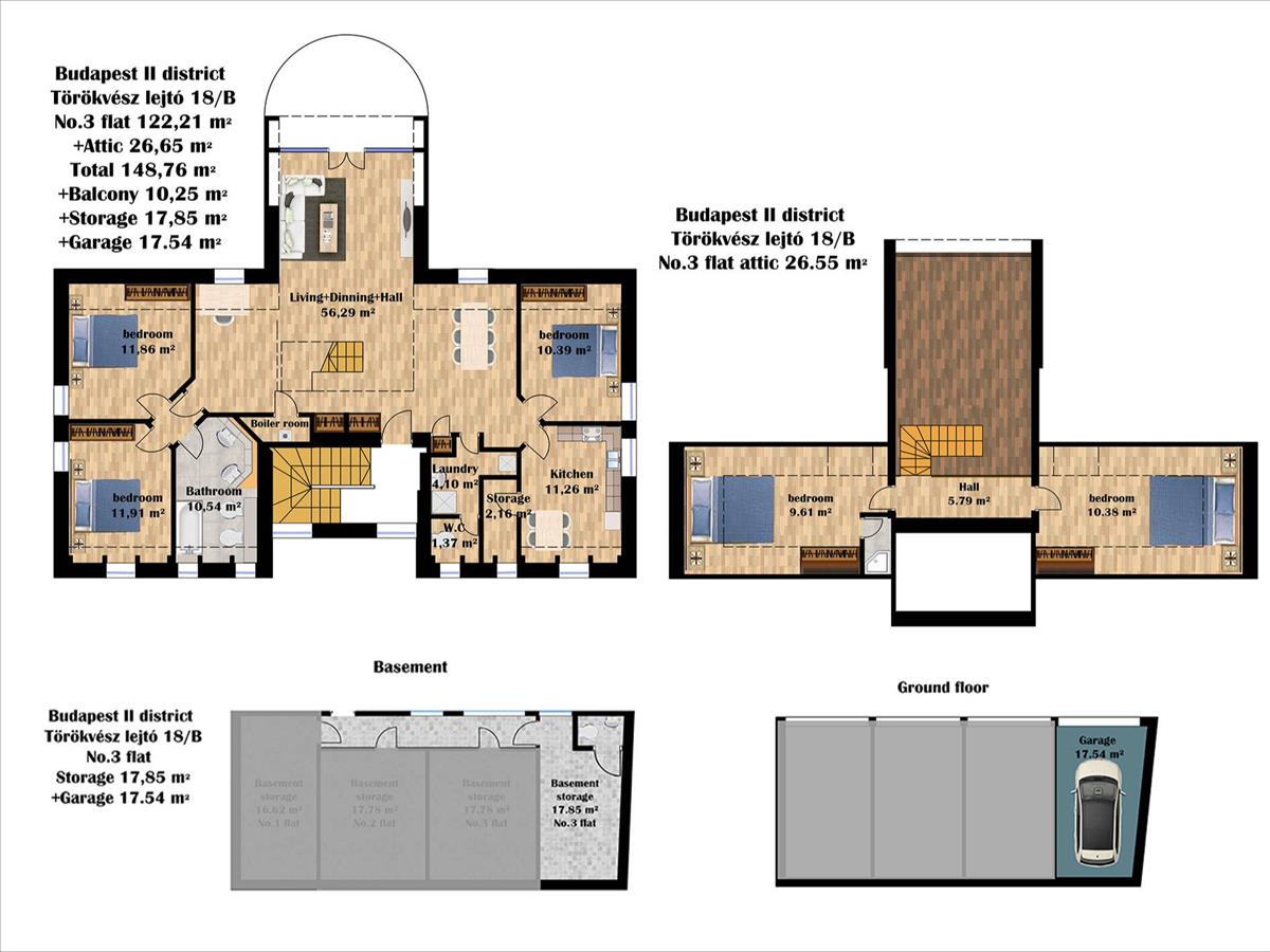 A lakáshoz tartozik egy 12 m²-es erkély, egy 15 m²-es tetőterasz, továbbá garázs - külön kocsibeálló (melynek használatát az ár tartalmazza), valamint egy 16 m²-es tárolóhelyiség is.