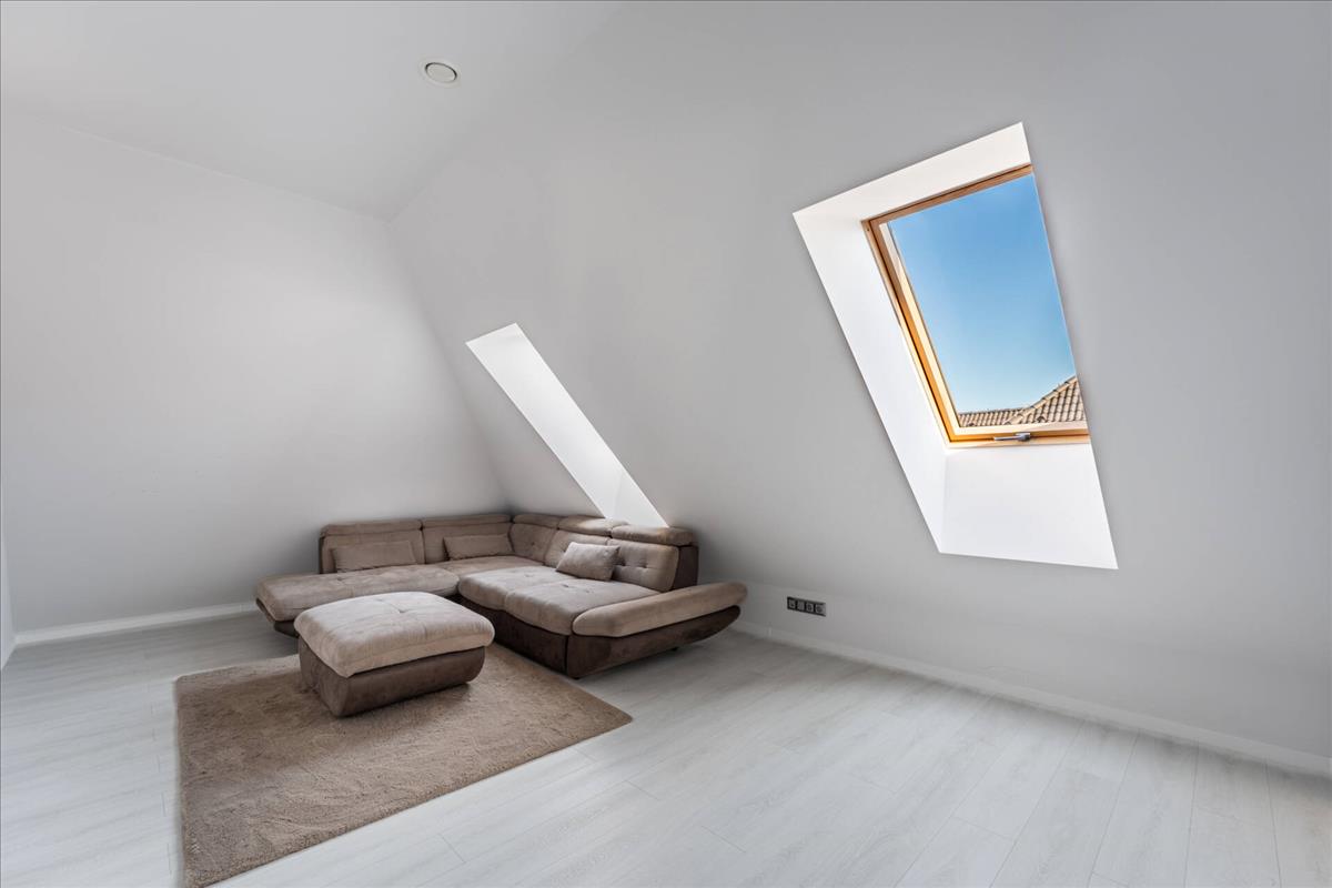 Továbbhaladva láthatjuk a második hálószobánkat, mely gyerekszobaként funkcionál, vele szembe a tágas nappali helyezkedik el, tömérdek nyílászáróval.