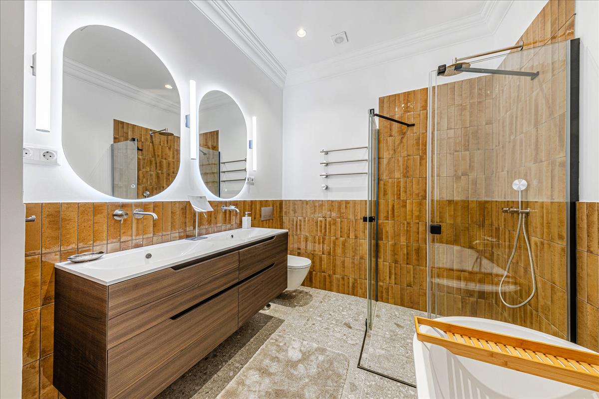 A felújítás során prémium minőségű alapanyagok kerültek beépítésre, a kivitelezés és a berendezés minden részletében a luxus és a minőség dominál. a lakás teljesen bútorozott és gépesített, magas színvonalú bútorokkal és beépített háztartási gépekkel, beleértve a mosógépet és a szárítógépet is, így az ingatlan azonnal költözhető.